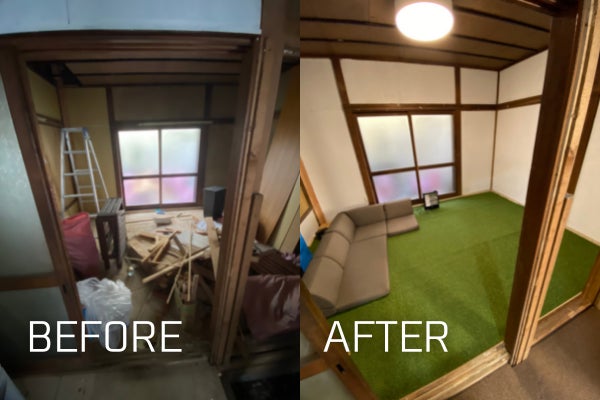 人工芝をひき、ソファー、プロジェクターを設置しました!!!