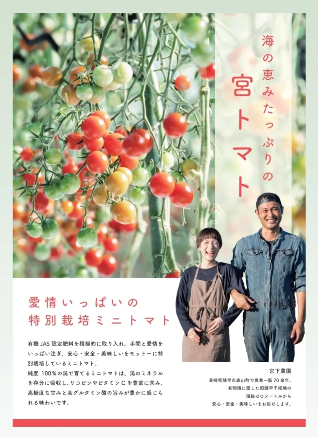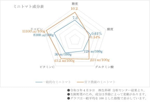 この特別栽培ミニトマトは、私の名前、宮下から文字を一文字とり、「宮トマト」と命名しました。現在、糖度別に3種類の宮トマトを栽培しております。