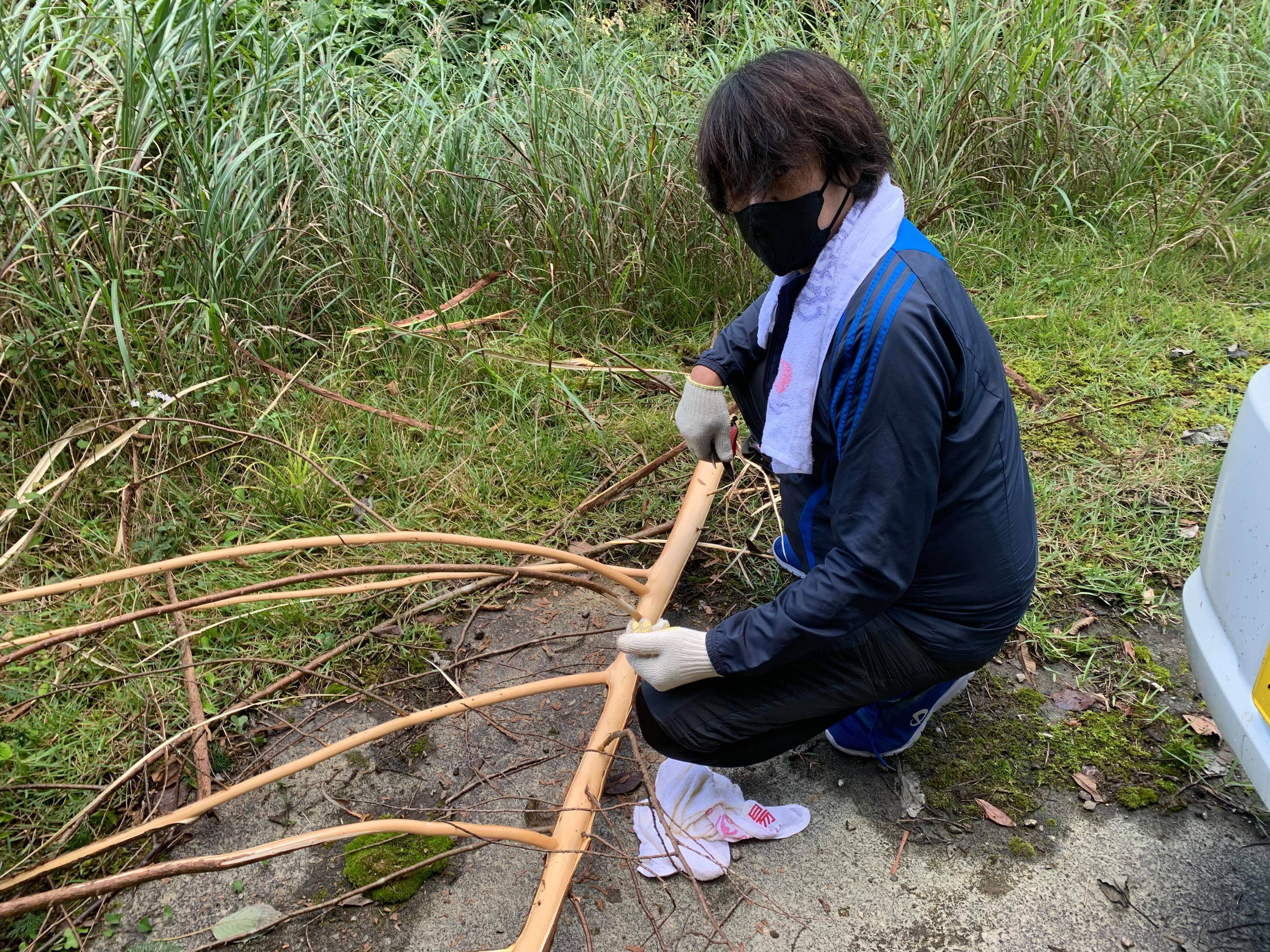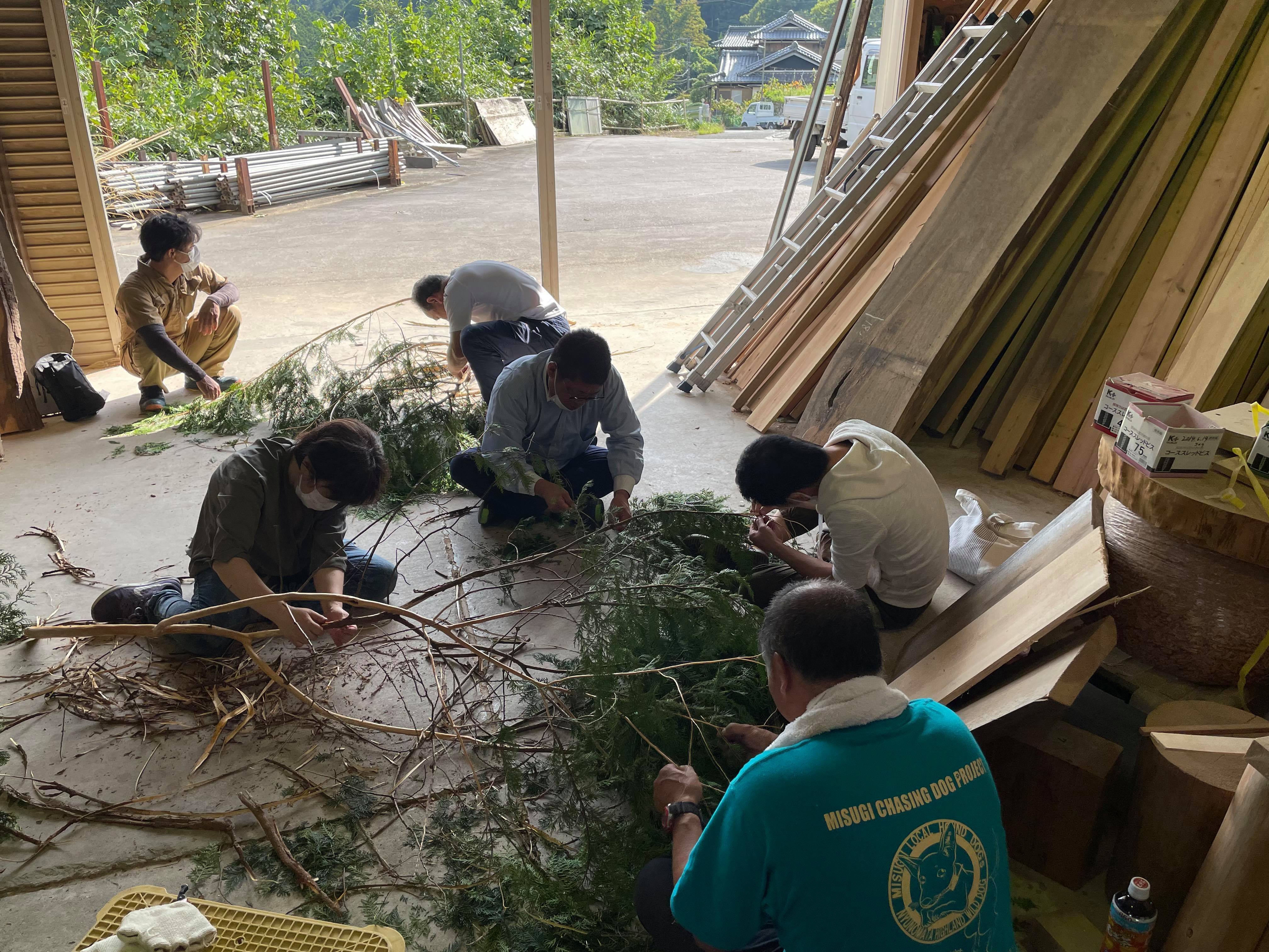 三浦さんにお願いしてシンボルツリーとなる木を切っていただきました。その木をメンバー全員で皮むきをしてシンボルツリーを作りました。その様子がこちらです。ひとつひとつ思いを込めて綺麗に皮をむきました