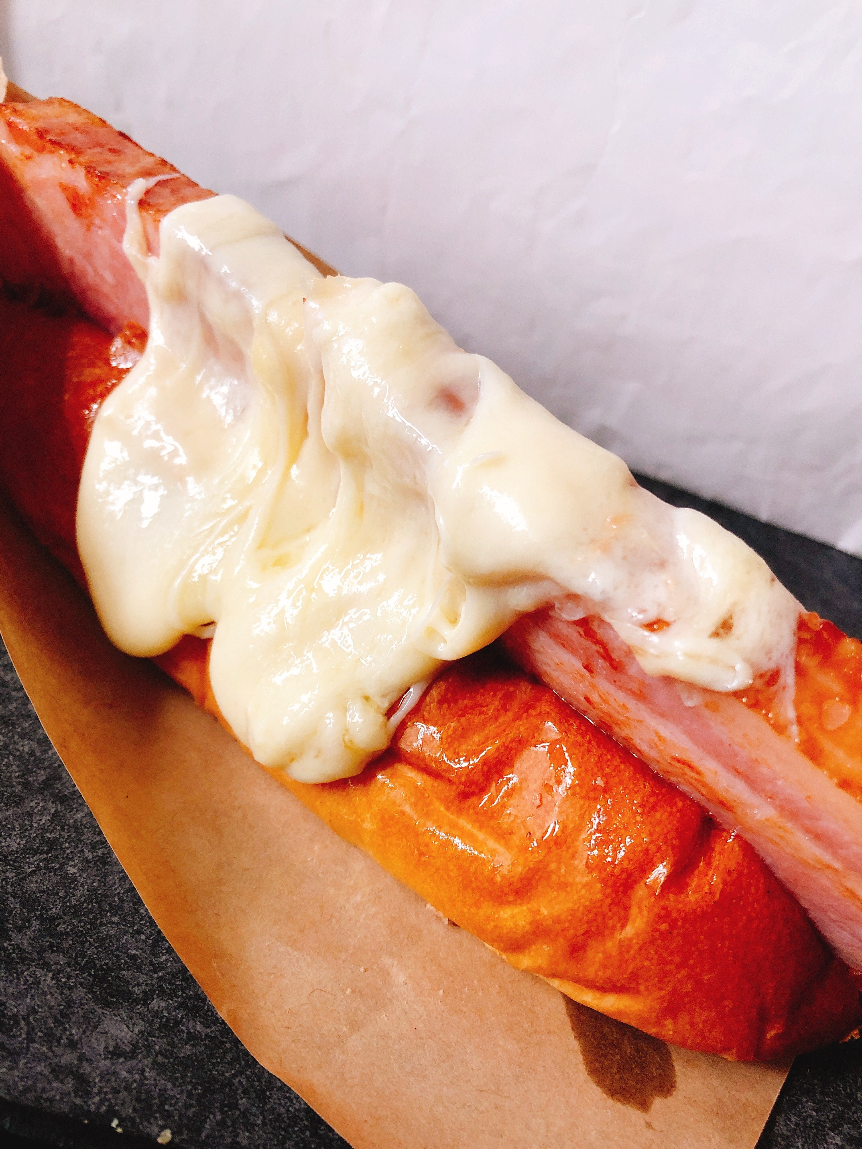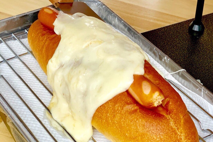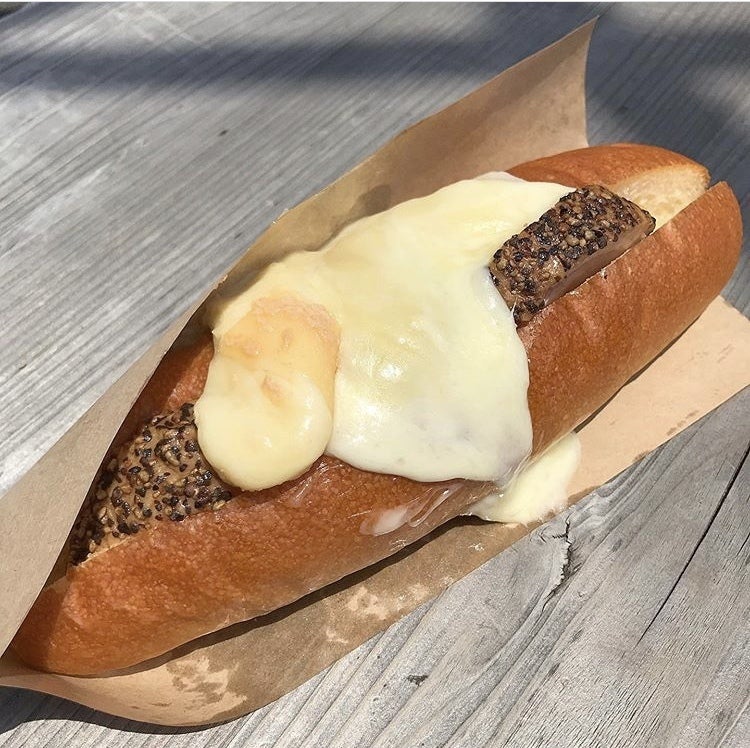 ソーセージは当初、細いタイプのを2本入れてボリュームを出していましたが食べづらさがあるとの意見を頂き1本でもボリュームがあるタイプに変更し食べづらさを解消しながらボリュームも残しました。ラクレットチーズの旨味と塩気、ソーセージの肉肉しいボリューム、それを支えるオリジナルバンズ。「三位一体」のラクレットチーズドッグ。