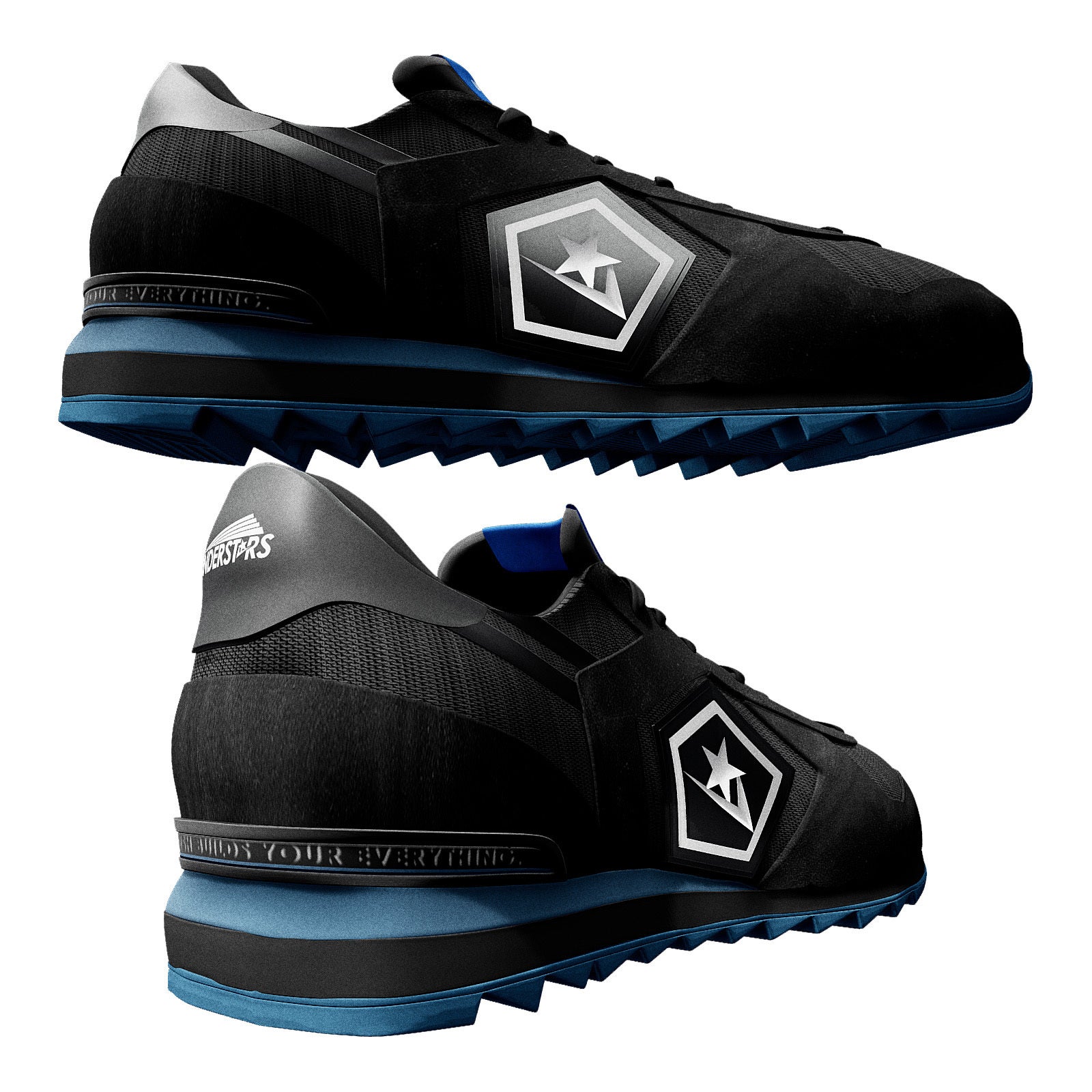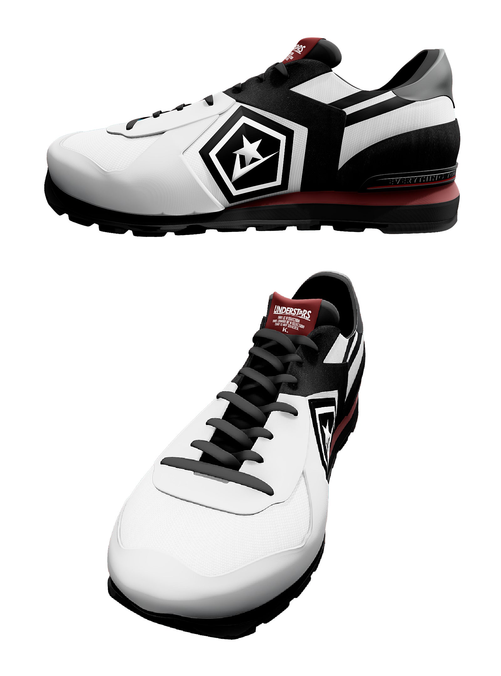 UNDERSTARS自体が星のスニーカーを構想しよう!という内容のため、このパーツを星にするのは自然な流れでしたが、こうすることでこのビッグスターを別色にしたカラーリングが展開可能、ビッグスター内の2本ラインで星の流れる様を表現可能、前から見たときに二分されたパーツのカラーの切り返しが斬新、などの効果を期待でき、一気に独自性が出たわけです。