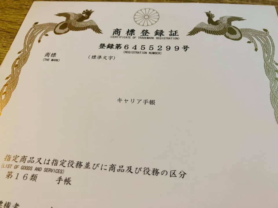 この度、出願していました商標申請につきまして、特許庁より登録商標として正式に登録されたことをご報告いたします。実は一度、申請を拒絶されていました。拒絶理由を確認、意見書を提出し再申請をおこない、およそ8か月間の期間を経て無事に商標登録いたしました。キャリア手帳のブランド確立と、今後の事業展開を踏まえた®マークがつくことは、とても意味あることだと考えております。今後とも弊社への変わらぬ応援をよろしくお願い申し上げます。■商標(THE MARK) キャリア手帳 商標権者:岡本 陽子 登録番号:第6455299号 登録日:令和3年10月13日 区分:第16類