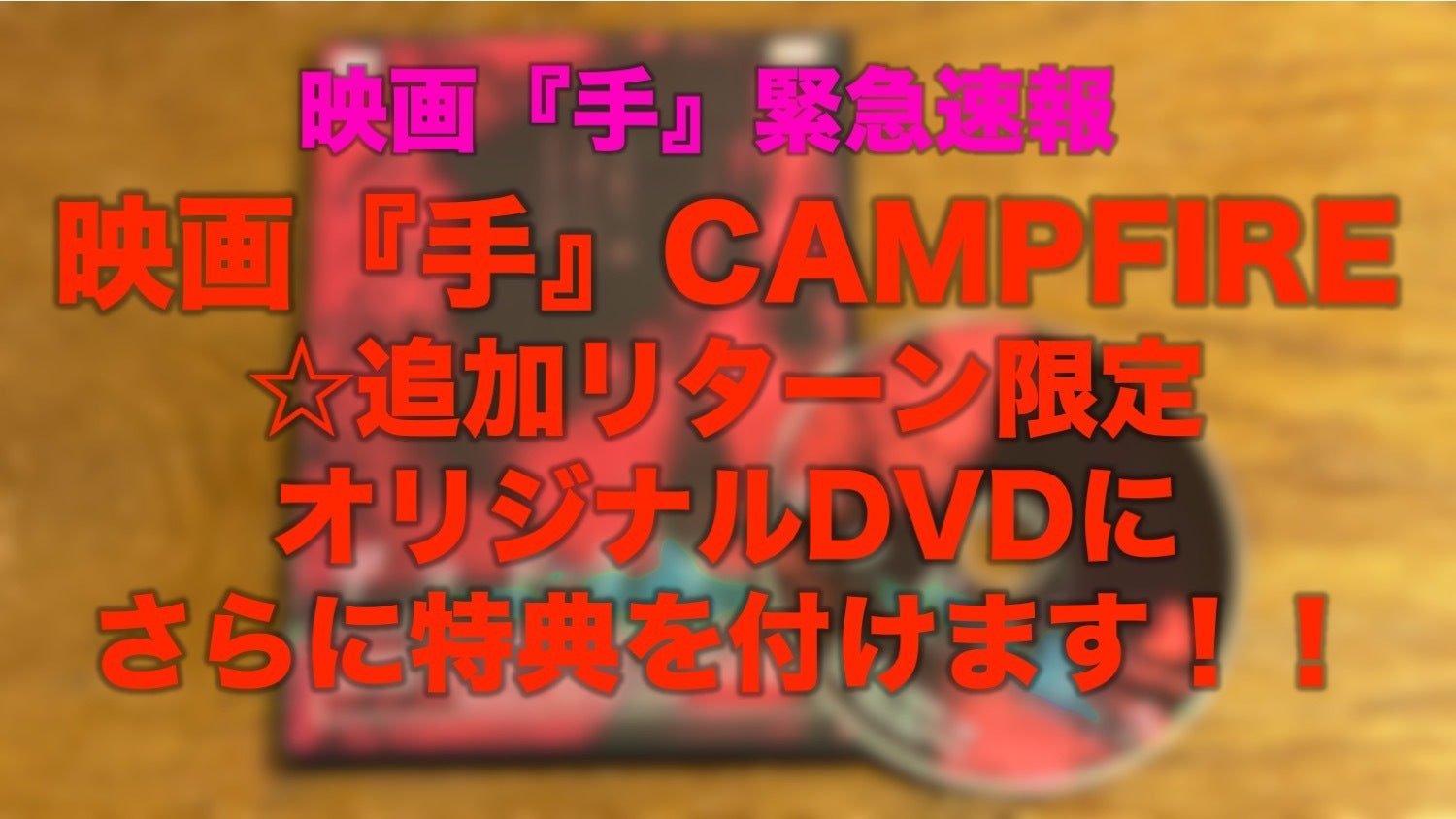 皆様お世話になっております。映画『手』プロデューサーの福谷です。早いものでCAMPFIREのクラウドファンディングも残り10日となりました。目標達成に向けてご支援を頂けると有り難いです。12月2日に発表させて頂きました追加リターンの「映画『手』完全版限定オリジナル本編DVDの提供」のリターンにさらに特典をお付けします!それはなんと!特典で本編の収録されたBlu-rayを付けます!ディズニー作品のBlu-ray買ったときのMovieNEXみたいな感じになります。Blu-rayということは単純画質ではDVDの上位互換が特典で付くことになります。さらにオリジナルDVDのジャケットは今回のクラファンのリターン限定のデザインと盤面も映画のデザインのものを印刷したものになります。※白焼きのディスクに油性マジックで書いたものとかではございませんので。オリジナルDVD提供が含まれるエキストラ出演権と打ち上げ参加券(新バージョン)にもこちらの特典は適用されますので、ご心配なく!なお既にSOLDOUTしている打ち上げ参加券の劇中登場した造形物をオリジナルDVDに変更も可能ですので、ご支援された方は備考欄でお伝えして頂ければです。特典の追加に関して配信による動画でも解説しております。↓↓映画『手』緊急速報 ☆追加リターン限定オリジナルDVDにさらに特典を付けます!https://youtu.be/o2mT-8FCA2A何卒、ご検討を宜しくお願い致します。福谷