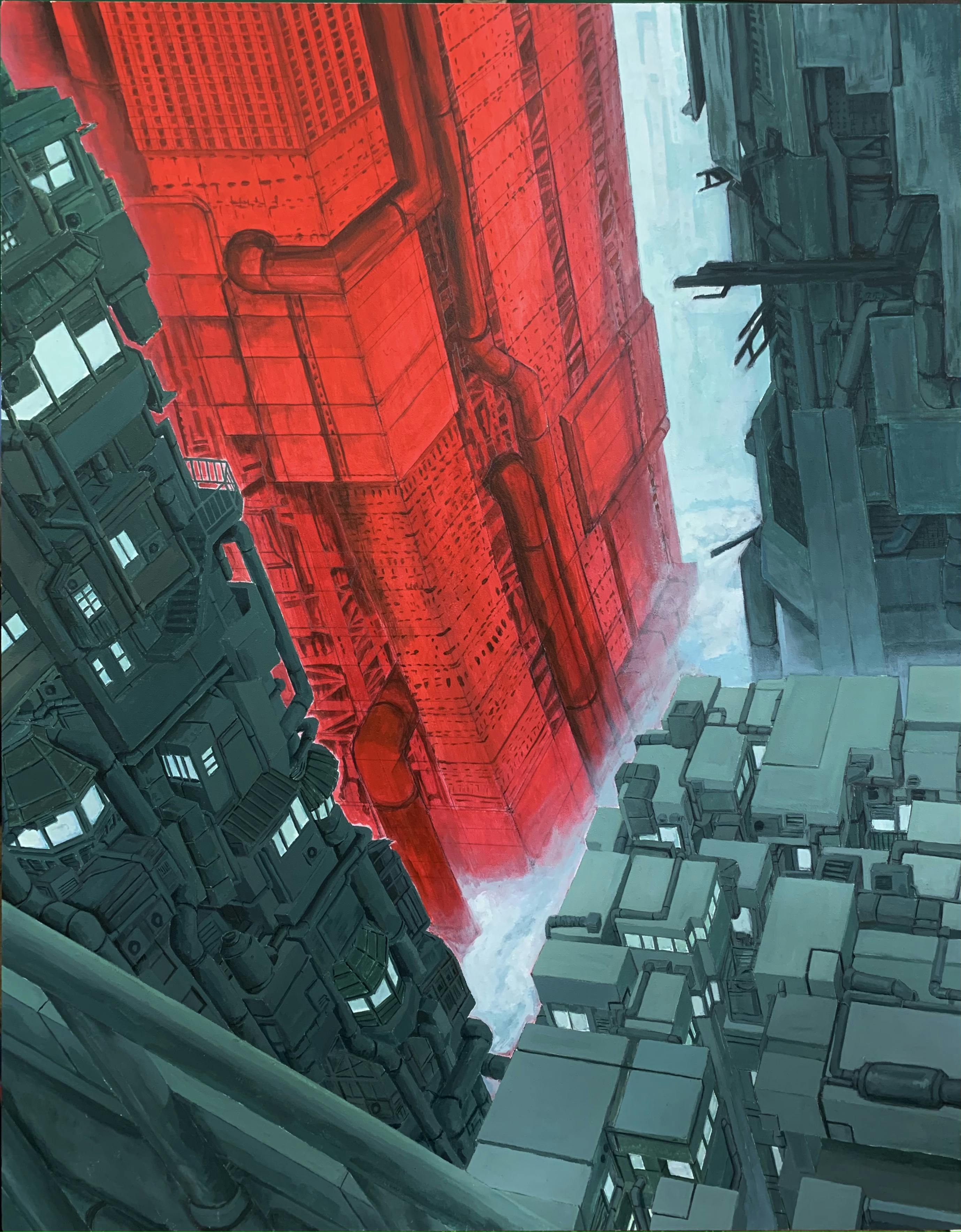 題名の中にある樹状構団柱とは画面の柱上の構造物であろうが、手前緑色の柱には窓があり、灯りがついている。人影は見えないが住居としての役割を果たしているのか。