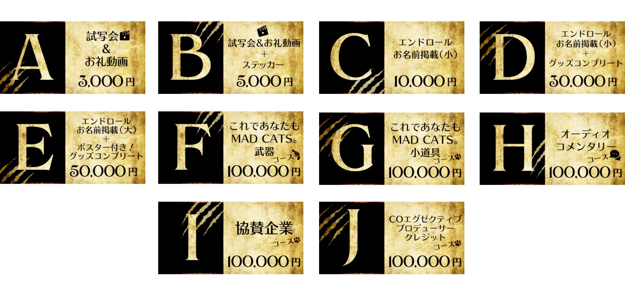 映画「MAD CATS」を愛したくなるような、様々なリターンを用意しています。