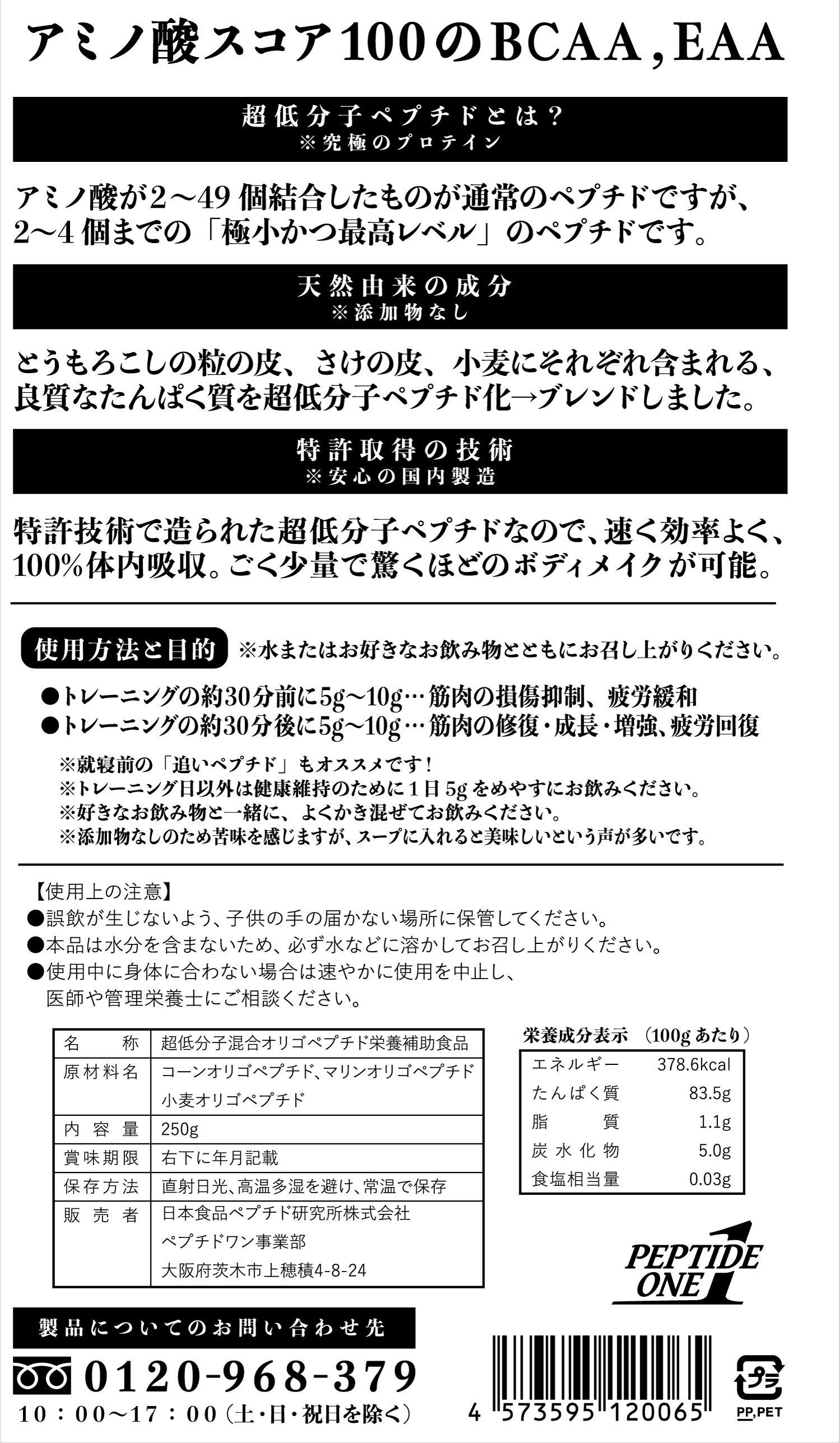 ※「究極のプロテイン」=プロテイン(タンパク質)、ペプチド、低分子ペプチド、超低分子ペプチドの中で、最も低分子で吸収効率が良いことを意味します。
