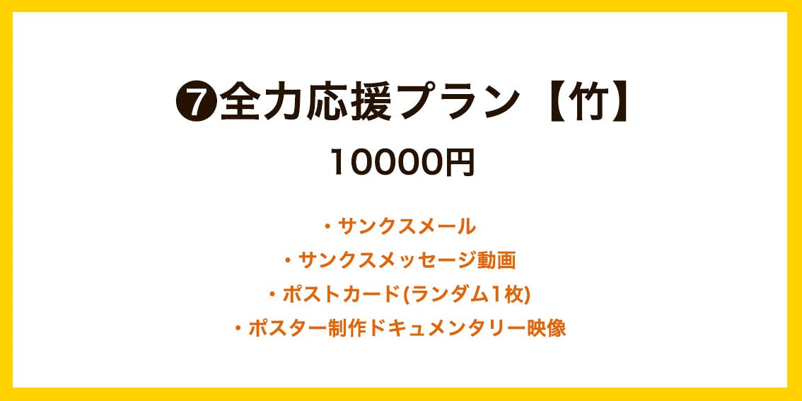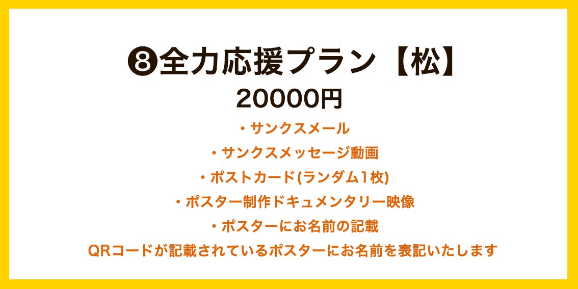 サンクスメール、サンクスメッセージ動画、ポストカード1枚(ランダム)、ポスター制作ドキュメンタリー映像をお届けします!