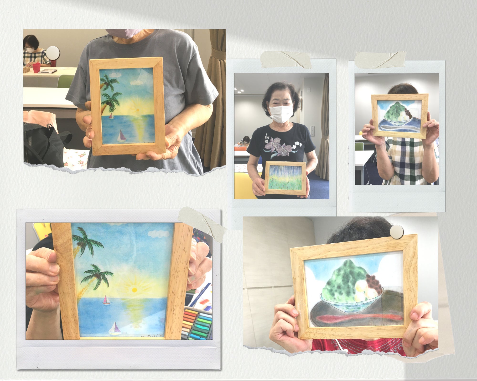 「思い出アート」を実際に制作された方々からは、「いつも引き出しの奥底にしまってあったものが、作品になって飾ることで、とても明るい印象の光の当たるものに変わった感じがしました。」「絵が描けなくても下絵があるので、塗り絵ができる方ならどなたでもできると思いました!」ととても嬉しいご感想をいただいております。