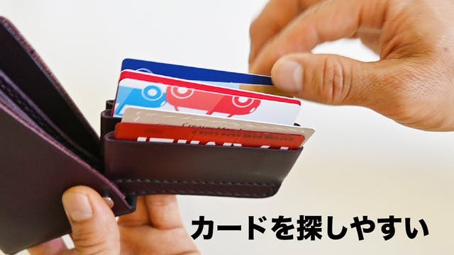 各パーツがグイっと外に出る独自の仕様。ミニ財布の課題だった「カードの探しやすさ」