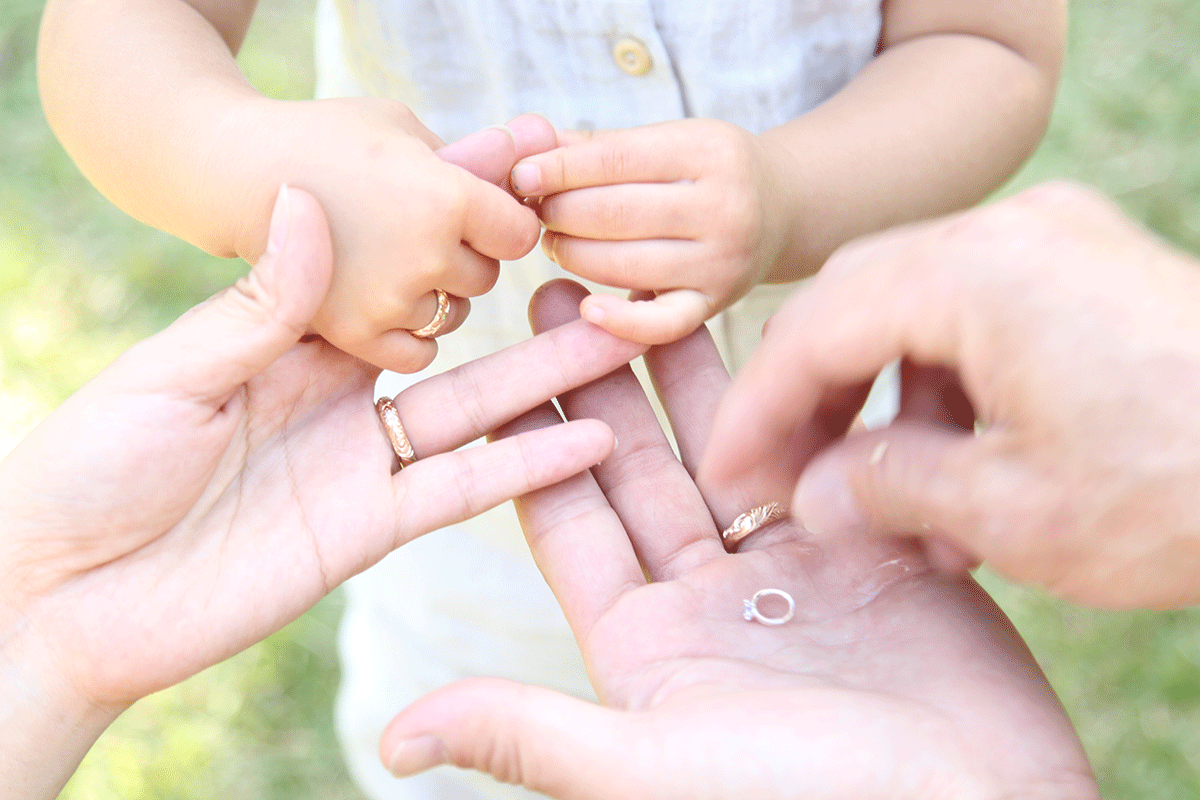 そんな沢山の写真の中に一枚、たとえば赤ちゃんの手とパパママの手、ベビーリングを一緒に写真として残しておけば、ベビーリングを通して「あの時こんなに小さかった手が大きくなったね」と子供の成長を実感できる素敵な思い出の一枚となることでしょう。