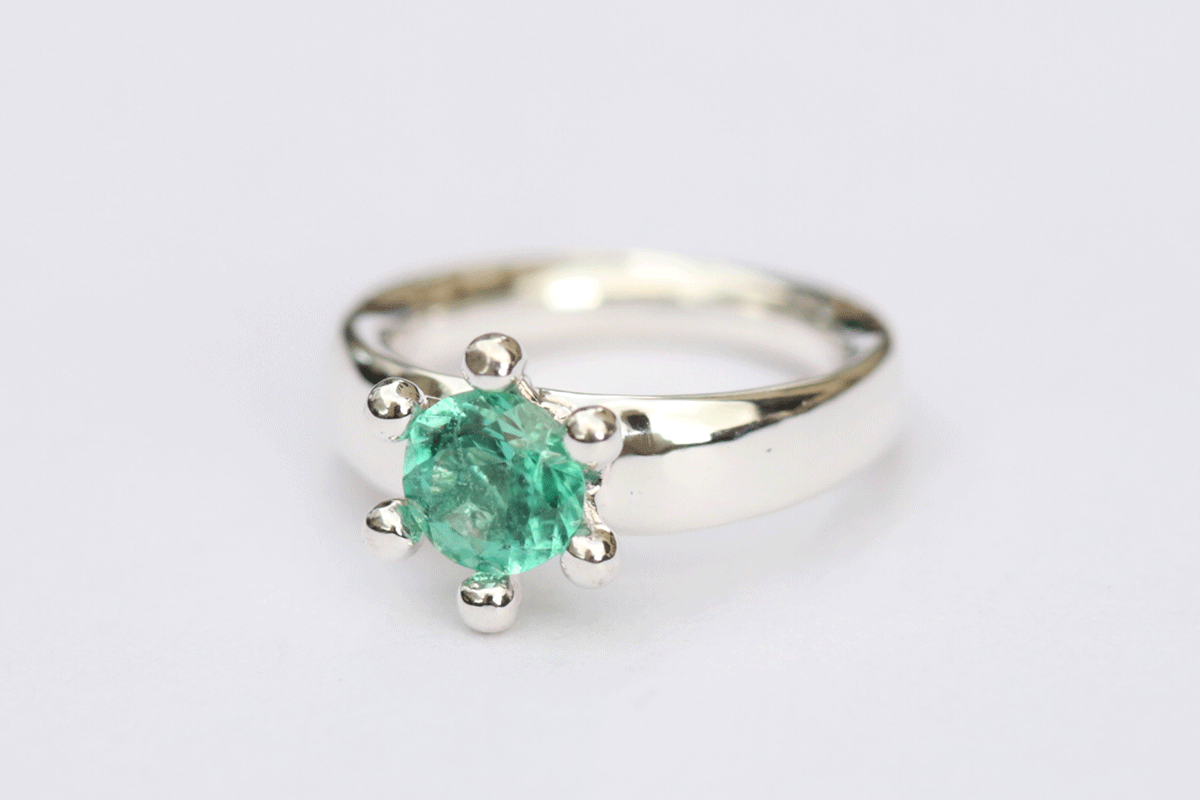 「恋愛成就」「幸運」「安定」など、愛の象徴としてしたしまれていることから、エメラルドは貞節・純粋を守った夫婦を心から祝福する宝石で、かけがえのない安らぎを覚えた夫婦の記念石でもあります。