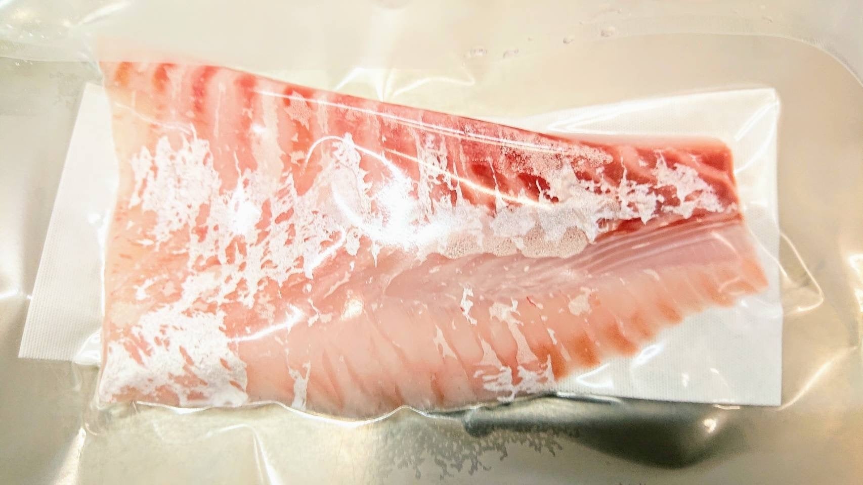「凍眠」とは(株)テクニカンが販売している液体急速凍結機(リキッドフリーザー)で、-30度まで冷やしたアルコール液が入った液槽に、真空パックした食品を漬けるだけで、急速に凍結させることができます。その速さは従来のエアブラスト凍結の20倍。氷結晶を極小に留めることができるので、解凍時に細胞壁が破壊されにくく、ドリップが出ないのが特徴です。