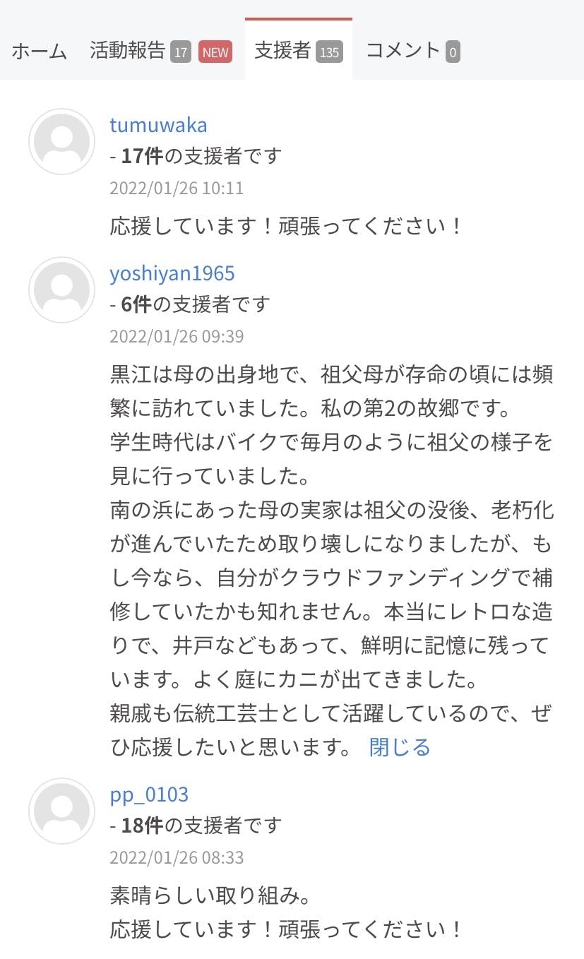 ご支援に添えられているコメントにもパワーを沢山いただいています。