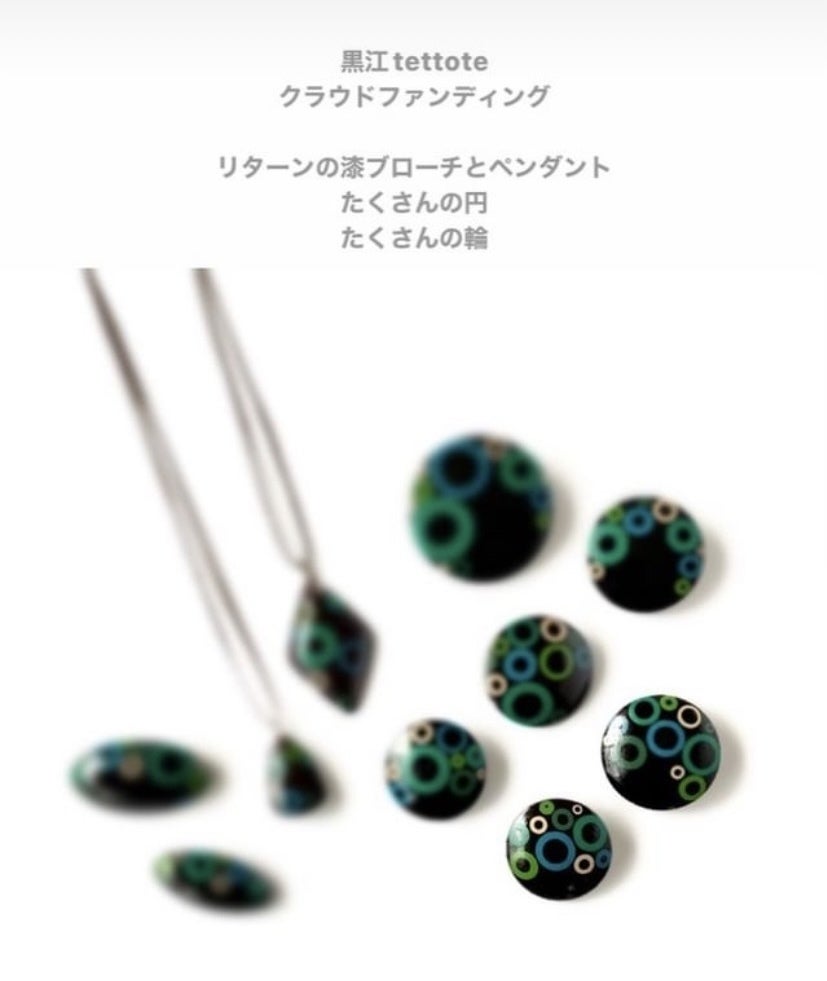 残り5日となりました。応援、心よりありがとうございます。漆アクセサリーが完成し、漆芸家ReikoHashizume氏が出来上がりの写真を投稿してくれてます。たくさんの円、たくさんの縁が集まっていますね。表情の違う作品、どの作品がお手元に届くか支援者の皆様たのしみにお待ちください。リターンの発送はクラファン終了後、2月中旬以降を予定しています。campfireより案内がありました。支援時にクーポンコードを記入いただくと5%off が始まっています。ご支援時にはご利用ください。あと5日!達成に向けて、また『黒江tettote~旧岩崎邸』完成に向けて、頑張り続けますので最後まで応援のほどよろしくお願い致します★最終日: 1月30日(日)23:59:59支援総額:1,701,000円 68%達成 支援者:129人残り:5日