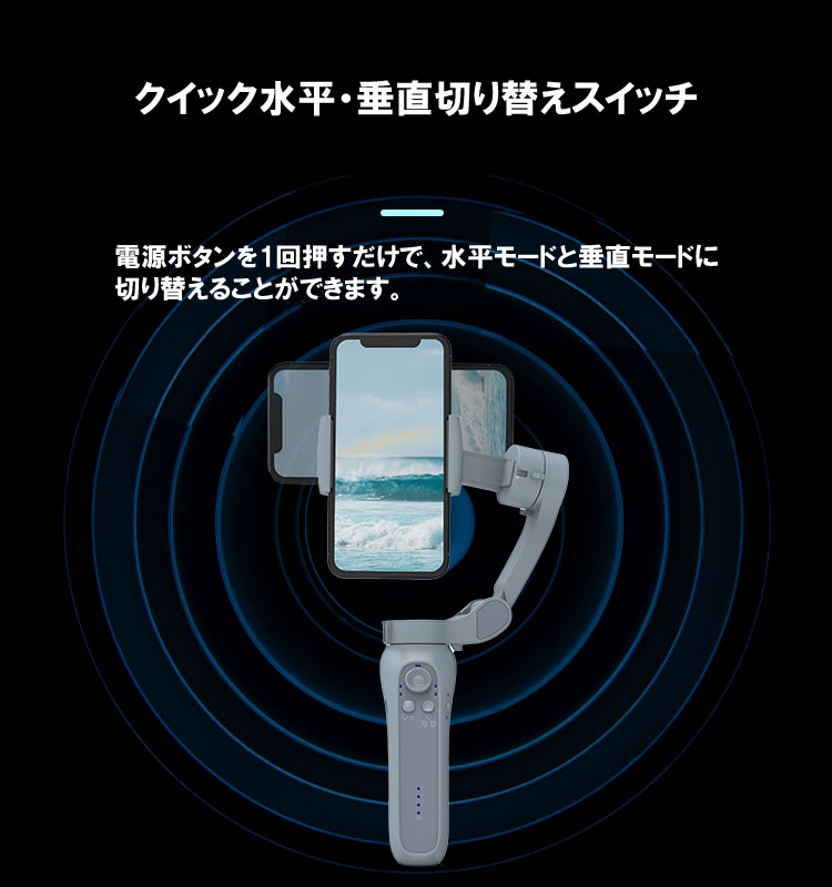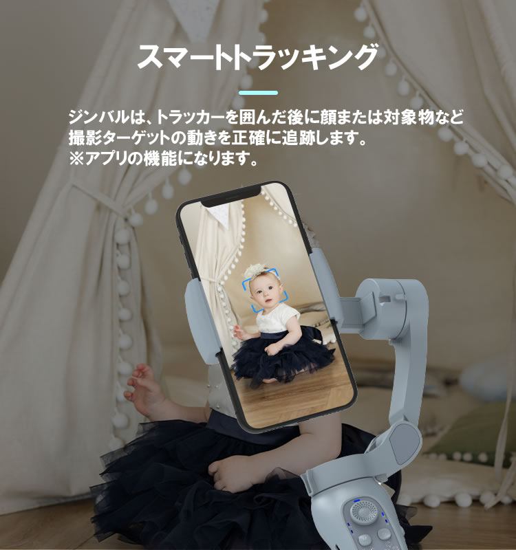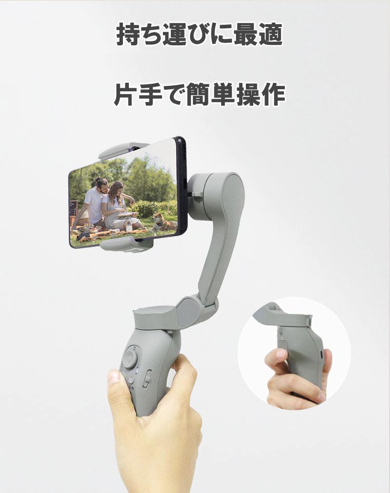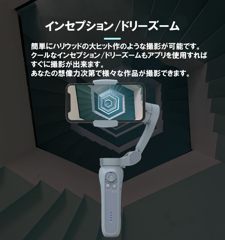 A:3軸で常にスマートフォンを安定させていますのでスムーズな動画が撮影可能となっております。