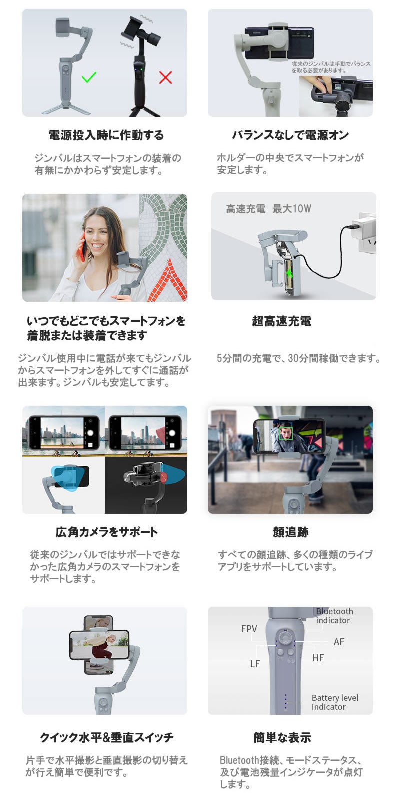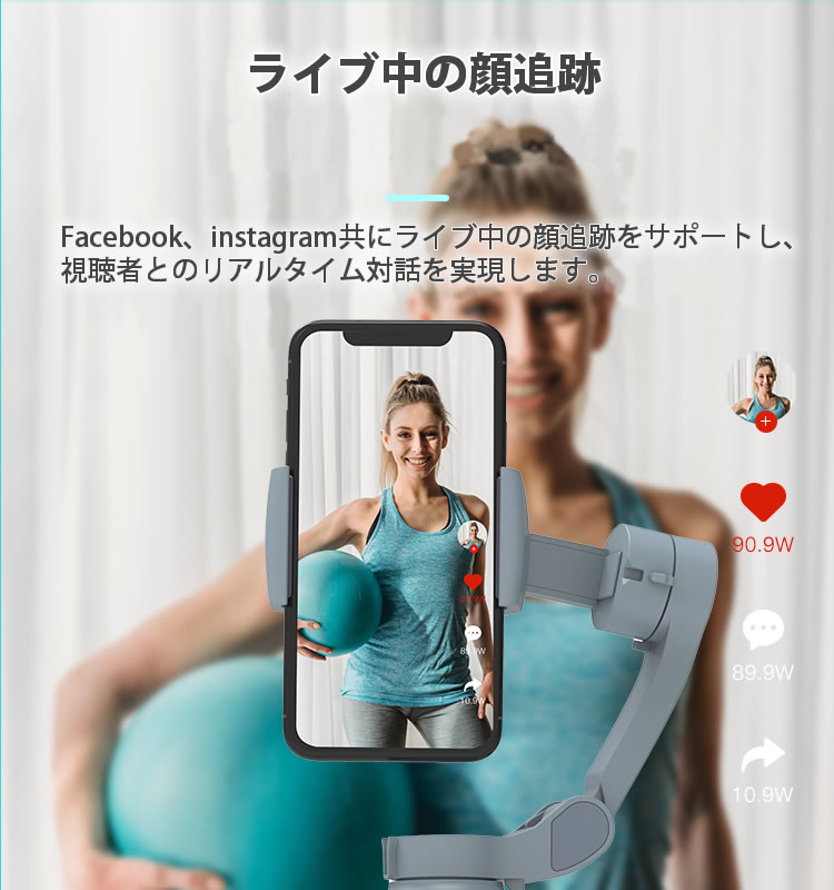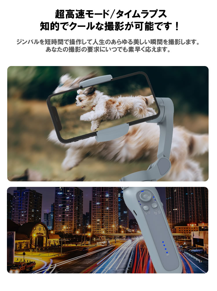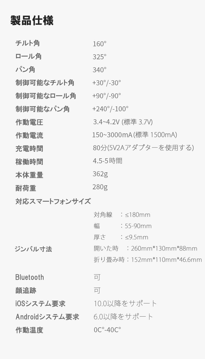 A:3軸で常にスマートフォンを安定させていますのでスムーズな動画が撮影可能となっております。