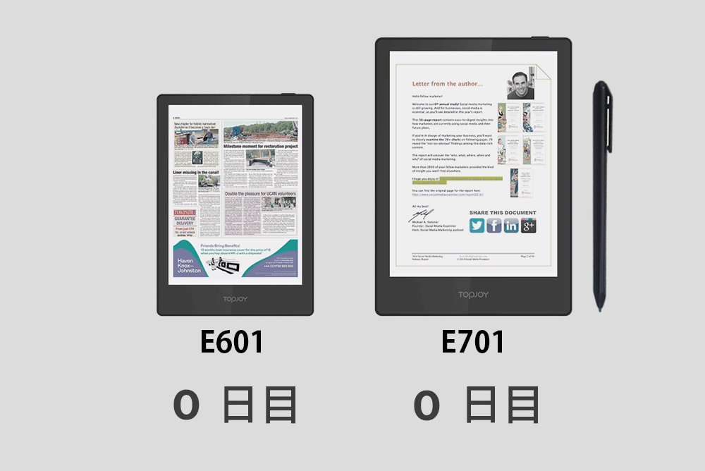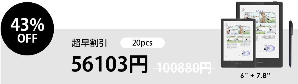TopJoy は3.8V 1500mah (6インチモデル)/3200mah (7.8インチモデル) の大容量バッテリーを搭載しているため、非常に長い時間を充電なしで読書できます。6インチモデルでは最大35日間、7.8インチモデルでは最大70日間待機可能です。