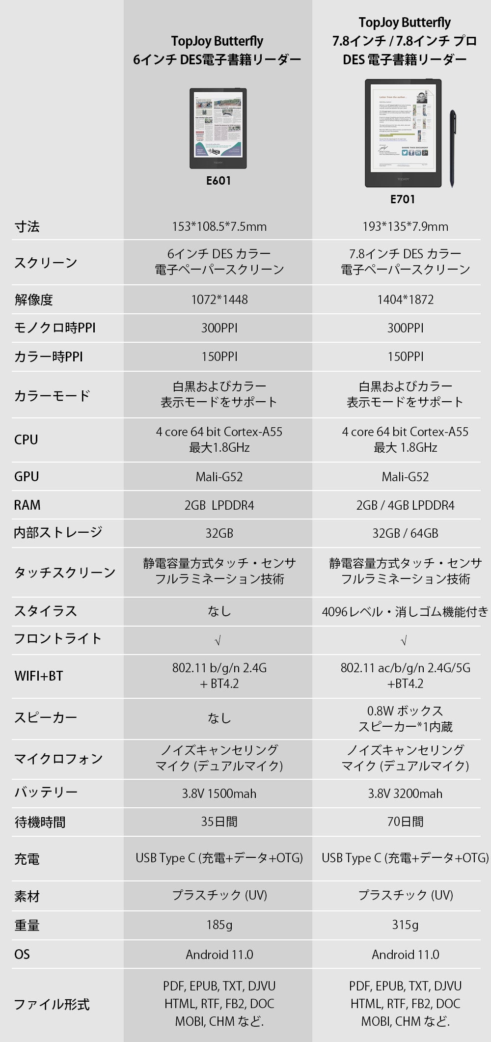TopJoy Butterfly は、6インチと7.8インチの画面サイズから選べる、多機能で携帯性に優れる電子書籍リーダーです。DESによるきれいな発色が可能なため、白黒表示時は 300 PPI、カラー表示時は150 PPI で表示できます。OS は Android 11を搭載しており、対応するファイル形式も多くあるため、どんなファイルでも気軽に読むことができます。