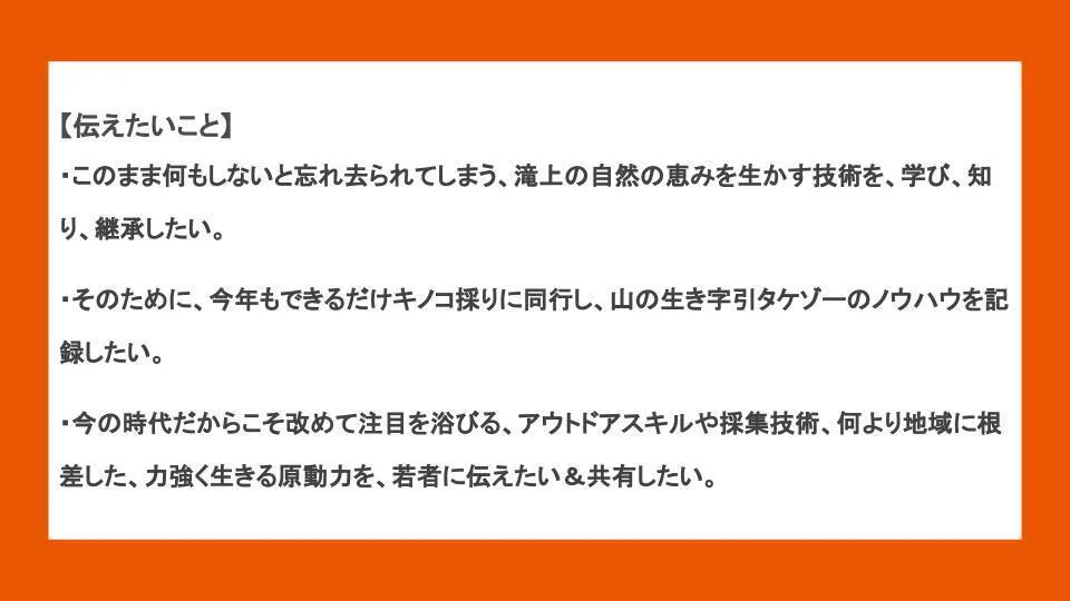 タケゾーさんはこれまで、たった一人で生計をたててきました。キノコ、山菜がとれなければ生活していくことができません。このままではタケゾー仙人が消えてしまうかもしれない、タケゾーさんにはキノコや山菜を採りながら今後も暮らしを続けてもらいたい。