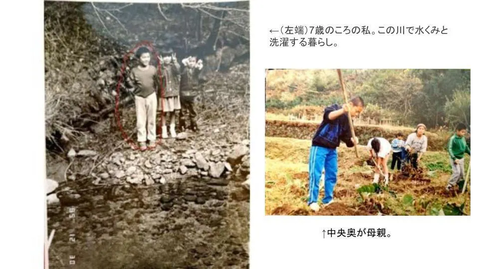 私は両親の教育方針で、父親は会社を経営しながら、母親と私と兄弟で、限界集落での自給自足な暮らしを学ぶという幼少期を過ごしました。当時、私は、電気も、ガスも、水道もない、山の中のでかやぶき屋根の古民家での暮らしから、自然の中で生きる事の醍醐味を骨の髄まで堪能し、すっかり大自然と農業の魅力に取りつかれてしまったのです。当時10歳の僕は、その暮らしを原体験に育ち、今でも自然の中で生きる事、農的な生き方にこそ、本当の豊かな人生があることに気づき、46歳になった今でも、その想いを軸に暮らす、農業家となりました。このころから、自給自足で生きる術を身に着けてきた。有機農業が大好きになったころの写真です。