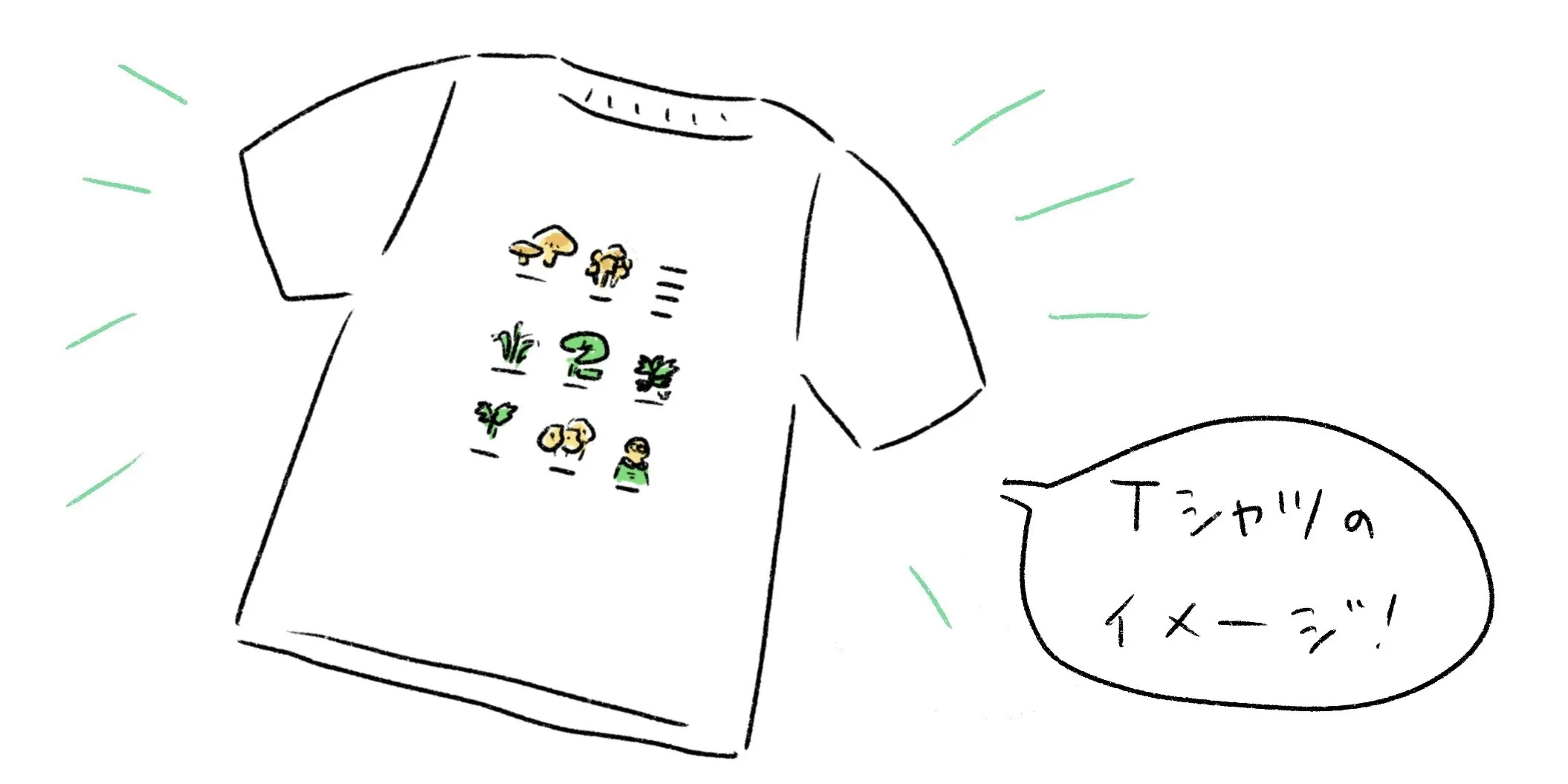 リターン品【キノコとタケゾーのイラストTシャツ】のデザインが完成しました!