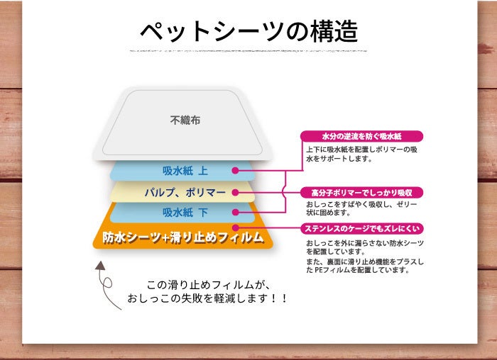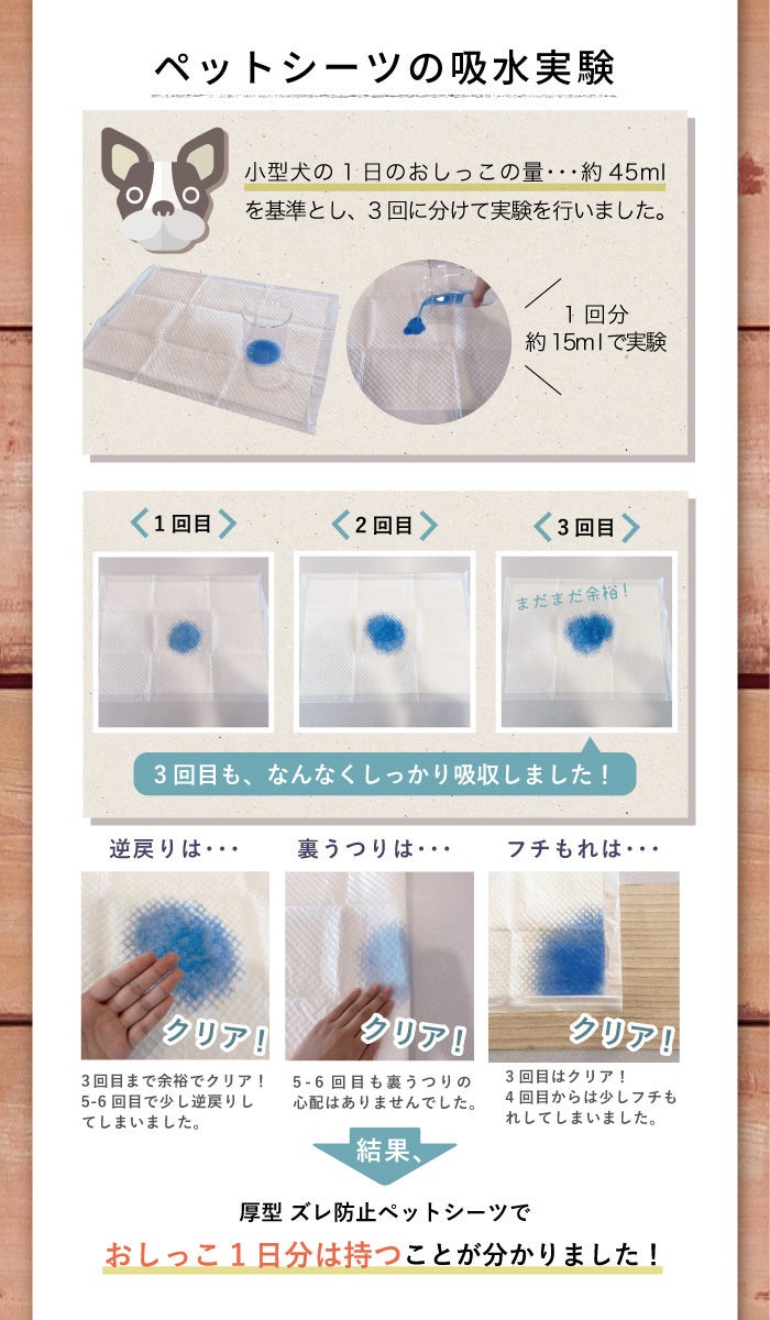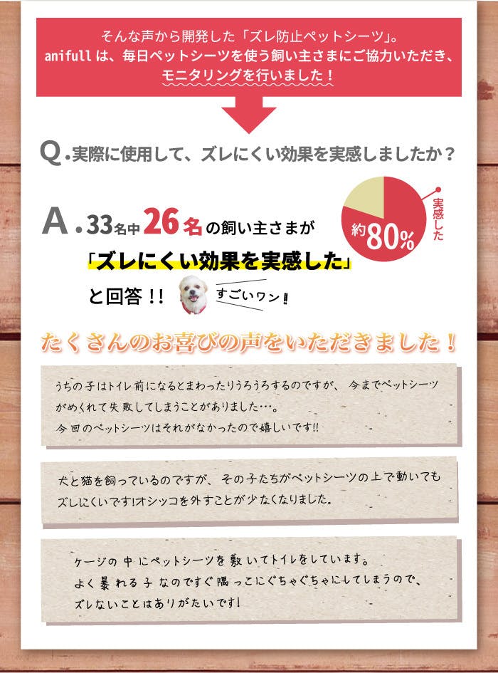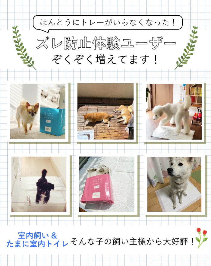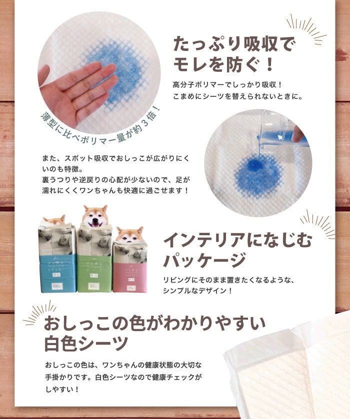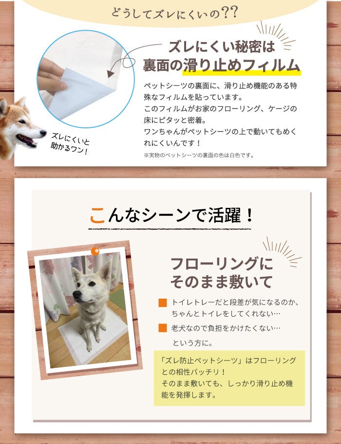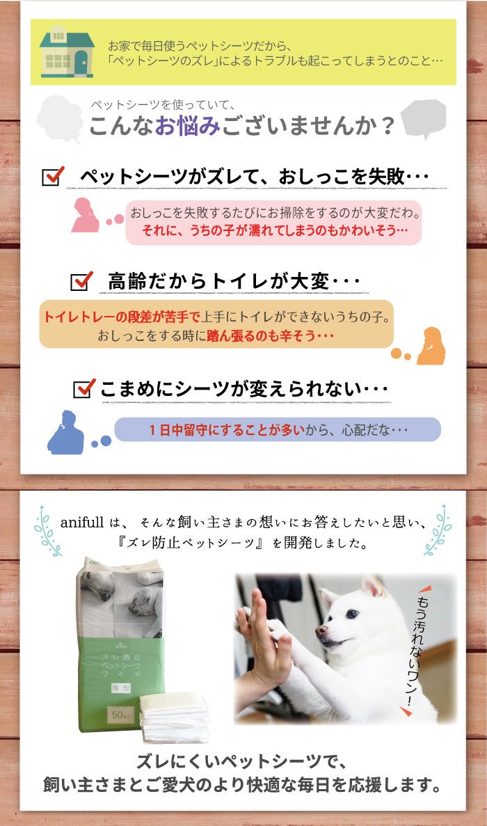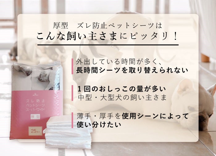 「ペットシーツがズレて、おしっこに失敗しちゃった…。」、「シーツの上で動くとすぐグシャグシャになって敷き直すのが大変...」そんな飼い主様の声から誕生したのが、「厚型ズレ防止ペットシーツ」です。「厚型ズレ防止ペットシーツ」を使っていただくことで、トイレにかかる負担を軽減し、ペットと飼い主様との楽しい時間をサポートしたいと考えています。また、高齢犬などペットシーツがズレることで踏ん張れない子にも優しいペットシーツになっております。
