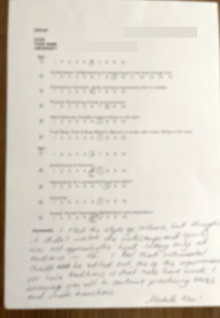 本競技会では審査員の採点シートを終了後に出場者に返却しています。審査員は、英語ではありますが全出場者に熱いコメントを残してくれます。ハワイのクムフラから直接コメントをもらえる機会ははなかなかありません。その機会と内容はフラだけではなく、今後の人生に大いに活かせるものになるはずです。ジャッジシートの一例