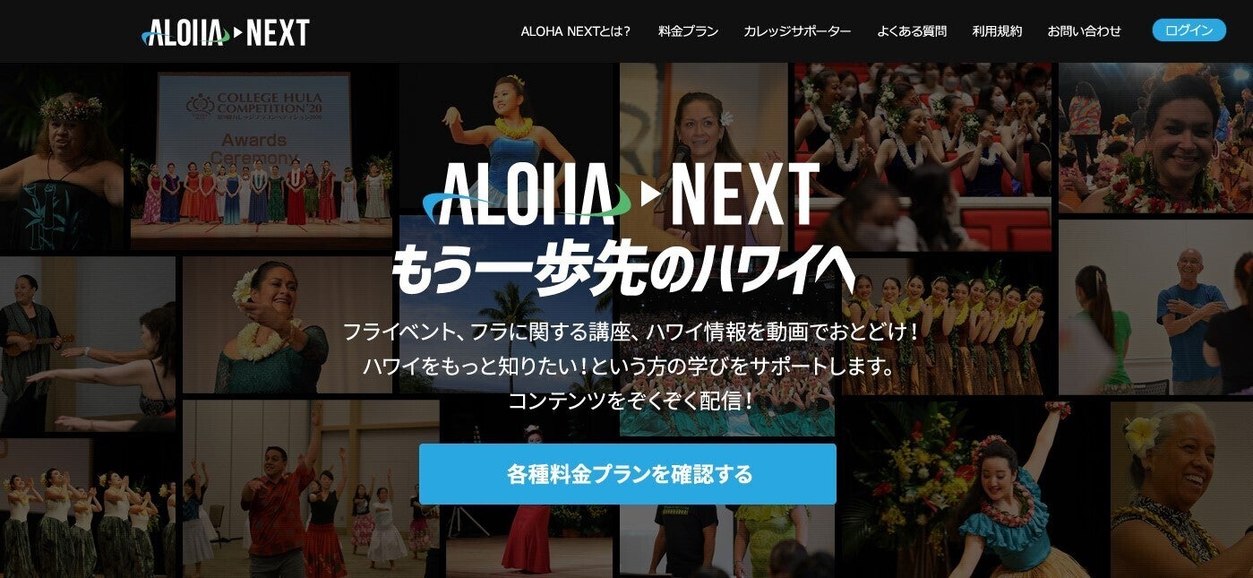 更に新型コロナウイルスの影響もあり、家にいながらもハワイを楽しめる・フラを学べる「アロハネクスト」という動画サブスクリプションサービスも2021年から開始しました。学生でも入会できる年会費制としており、「フラダンサーに役立つ情報」をコンセプトに、ハワイから最新の情報をお届けしています。