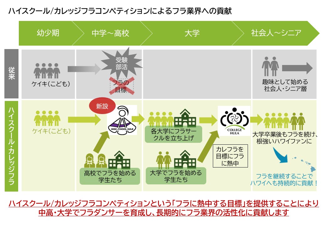 こういった現状を踏まえて、私たちは「若年層がフラを始め、そして続けていけるきっかけを作り、若年層フラダンサーを育成していく必要がある」と考えるに至りました。