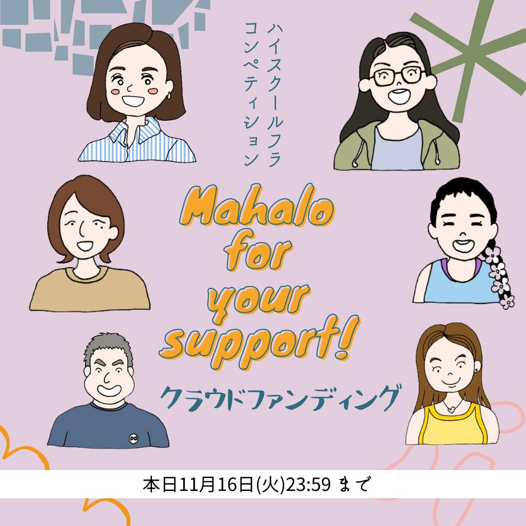 2021/12/07 14:22みなさん、こんにちは。カレッジフラコンペティション実行委員会です!この度は本クラウドファンディングへの応援、誠にありがとうございました。ご支援いただいた第1回ハイスクールフラコンペティション2021ですが、11月20日(土)に終了いたしました。開催から2週間経過し、新型コロナウイルス感染症の発症報告もなく、無事大会を終えることができました。こちらに開催報告を記載しておりますのでぜひご一読ください♪https://www.highschoolhula.com/2021/news/2021report/また、スタッフが撮影したVlogをYouTubeにアップしておりますのでお時間がある際にご覧いただければ嬉しいです!https://youtu.be/IChHZfk75AM他にもスタッフによる振り返りや、今後ダイジェスト等もあげていく予定ですのでまだの方はぜひチャンネル登録をお願いいたしますm(__)mリターンについて本日までに皆様にThank you letterをお送りしましたが、お手元に届いておりますでしょうか。入賞した皆さんの写真を紹介させていただきましたが、大会の結果はホームページに掲載しておりますので下記をご参照ください。https://www.highschoolhula.com/2021/partners/2021results/Tシャツ、DVD、Blu-rayのリターンは現在制作中です。Tシャツ→12月下旬DVD/Blu-ray→2022年1月下旬頃のお届け目安となっております。お時間を頂きますが、もう少々お待ちくださいませ!開催報告♪せっかくなのでこちらの活動報告でも素敵な写真たちを一部シェアさせていただきます…★(出演者全員分の写真は来週頃あがってくる予定なので、アロハネクスト会員の方は写真申込をしてお待ちくださいね♪)ミスハイスクールフラ2021 関東国際高等学校 夏目希楽々さんソロ部門第2位 松蔭高等学校 石川華子さんソロ部門第3位 三田国際学園高等学校 小池日和 さん団体部門優勝 武田高等学校 武田フラガールズ メリアの皆さん本当に、皆さん美しいですよね!!来年の高校生の演舞もとても楽しみです(´▽`*)最後にさて、2021年もあと3週間程度…と、慌ただしくなる師走の時期になりましたね。寒さが本格的になってきましたので、お体にお気をつけてお過ごしください。来年も、皆様にとって素晴らしい年になりますように。私たちも引き続き頑張ってまいりますので、来年も応援のほどよろしくお願いいたします。 もっと見る
