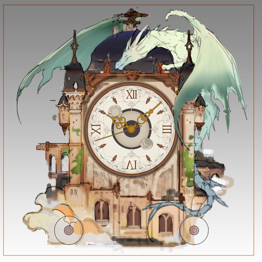 『時空の扉を開きし者コース』『永遠を奏でし者コース』『竜に愛されし者コース』のリターン「アクリルクロック」の、イラストレーターchibiさん描き下ろしイラストのラフを掲載しました。