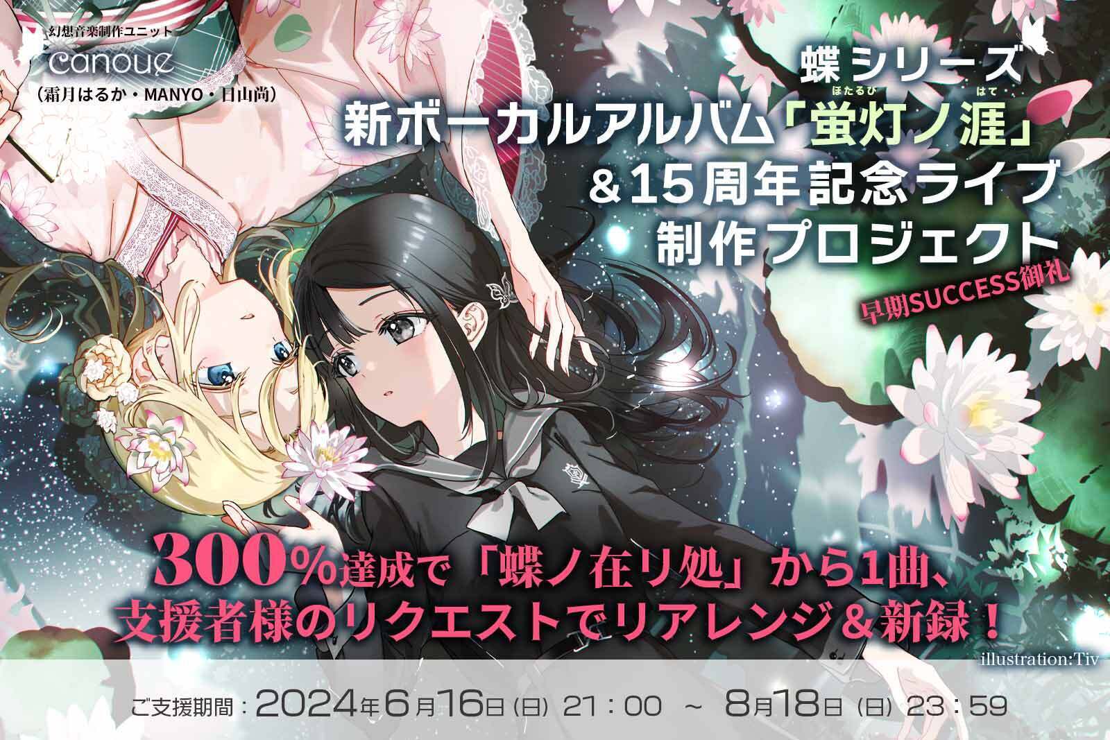 2024/06/17 17:22ご無沙汰しております。canoueです。アルバム『刻果てのクローカ』制作プロジェクトクラウドファンディングでは、多大なるご支援をいただき、改めてありがとうございました。現在、私達3人がユニットを結成するきっかけとなった和風ファンタジー企画「蝶シリーズ」の新作フルボーカルアルバム『蛍灯ノ涯(ほたるびのはて)』を制作中です。そして新作アルバム『蛍灯ノ涯』と前作『蝶ノ在リ処』の楽曲を、世界観と共にお届けするコンセプトライブを、シリーズ15周年となる2025年2月に開催すべく、準備を進めています。■蝶シリーズ新ボーカルアルバム&15周年記念ライブ制作プロジェクトhttps://camp-fire.jp/projects/view/757280このアルバムとコンセプトライブをファンの皆様と共に、より充実した内容で実現すべく、クラウドファンディングを実施中です。昨晩より募集をスタートし、皆様の温かいご支援をいただき早期サクセスいたしました。メンバー一同、気を引き締めて良い作品・ライブを制作していきたいと思います。募集期間は8月18日(日)までと2カ月程ございますので、企画内容やリターン等、もし好みにハマるようでしたら是非、ご支援ご検討いただけますと幸いです。どうぞ宜しくお願いいたします! もっと見る発売記念配信お礼&ストレッチゴール進捗