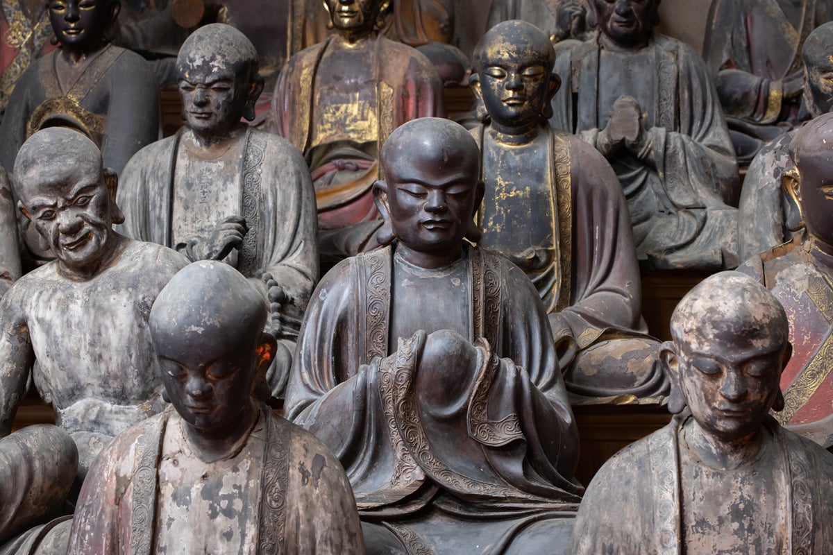 修復された羅漢像(中心)。他の羅漢像の修復が急がれる。