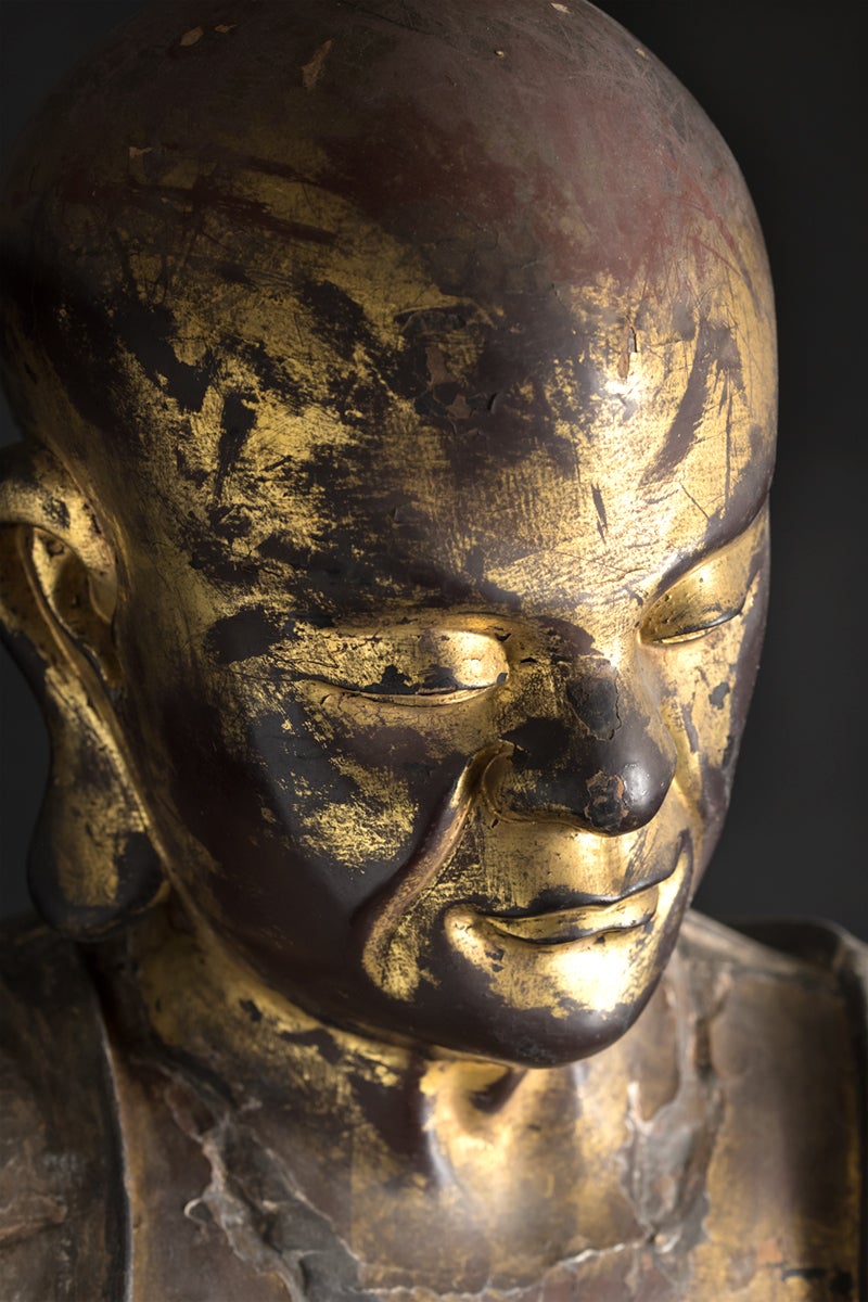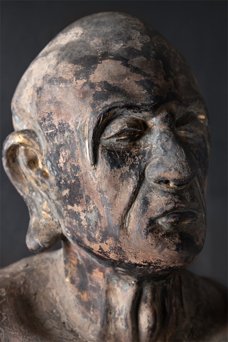 修復中の羅漢像。剥落した表層に時の痕跡を見る。気高い姿に心を打たれた。