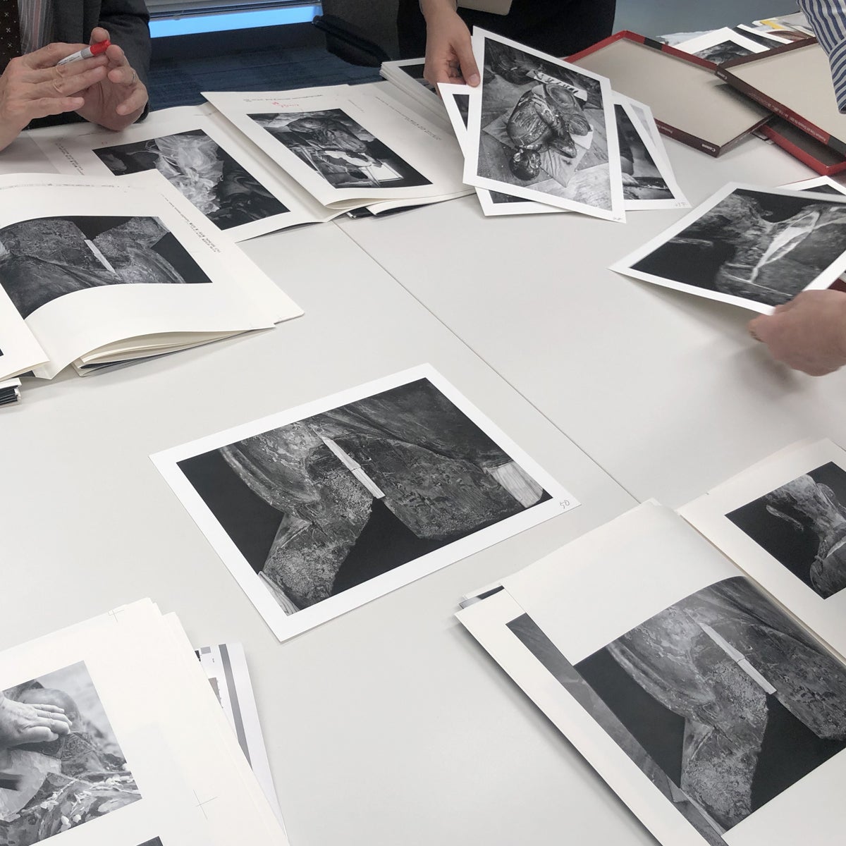 今回の写真集の印刷は、京都の本社がある日本写真印刷コミニュケーションズ(株)にお願いしました。ここは知る人ぞ知る、美術印刷の名門印刷会社です。ミーティング室にはずらりと製造した立派な写真集が展示されていました。さて、本日は写真集の初校に、りぼん舎の吉野さん、デザイナーの石山さんと3人で立ち会いました。データ入稿する際に添付したオリジナルプリント見本に照らし合わせ、色や調子をチェックしていきます。編集者とデザイナー、そして写真家、三人三様の眼でチェックし、日写さんと調整を相談していきます。全体の感想としては、初校としてかなり良く表現できていましたし、プロフェッショナルな印刷のお仕事を拝見できました。次回は、今回の指摘事項を反映させた二校目のチェック。どんどん、仕上がりが見えてきて楽しみです。