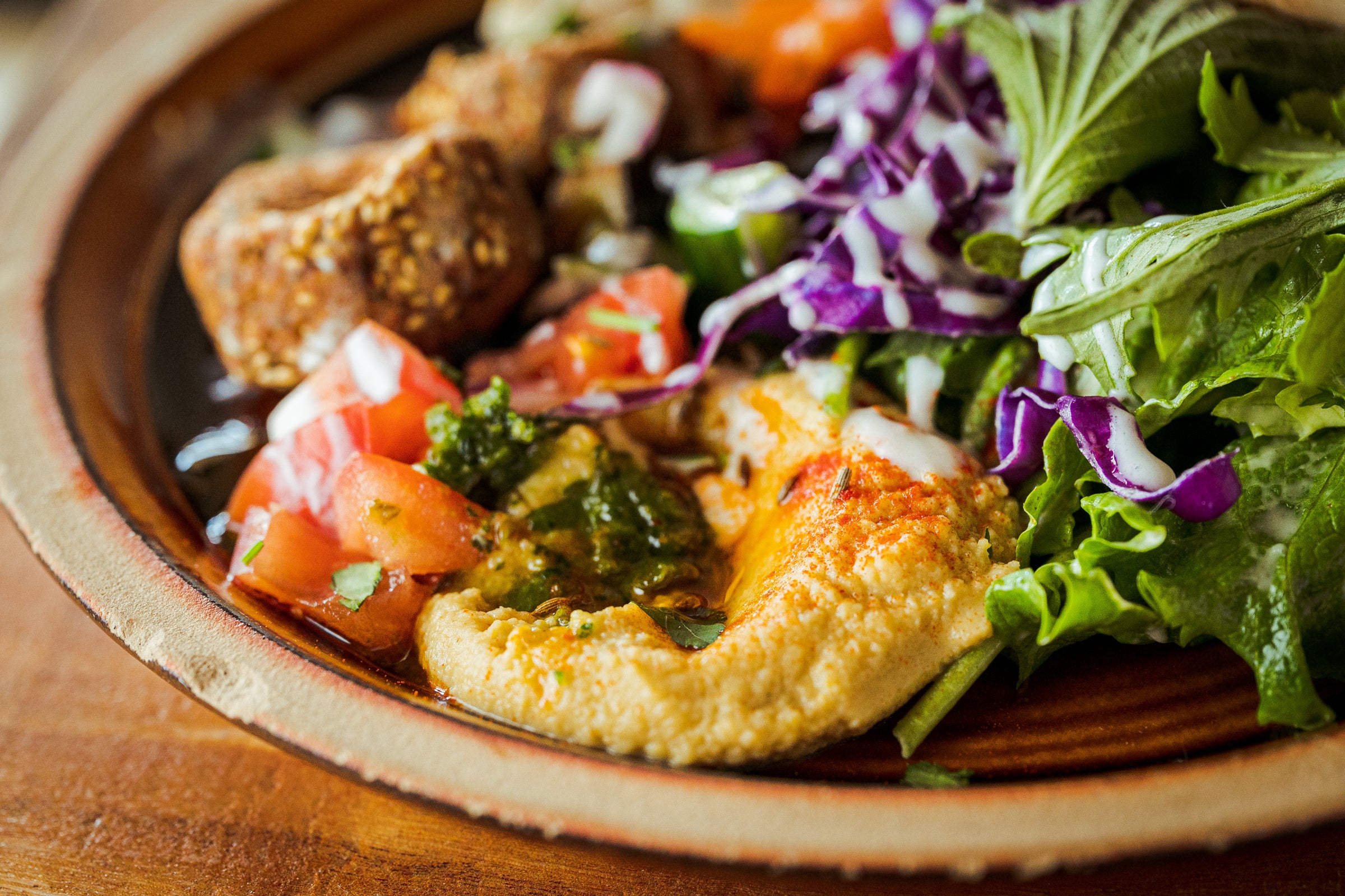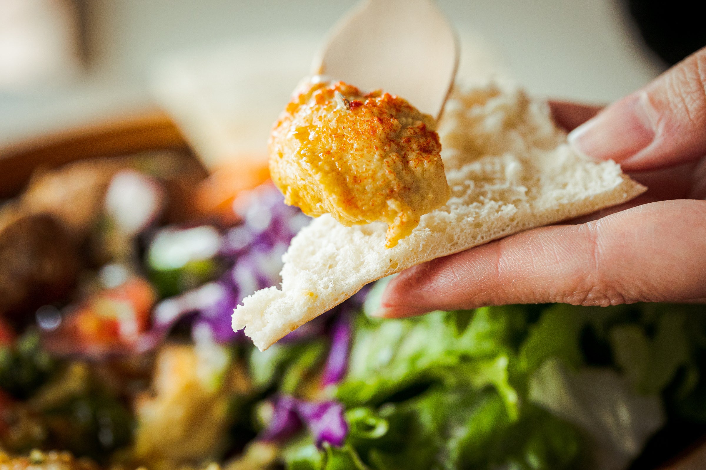 さらに、すりつぶしたスパイス、ハーブ、玉ねぎ、レモン、練りゴマ、ニンニクなどを合わせて揚げたファラフェルは、外はカリカリ、中はフワフワでまさに主役の食べ応え。シャキシャキとした野菜の食感や甘さが一層引き立ち、罪悪感なくあっという間に食べてしまうことでしょう。