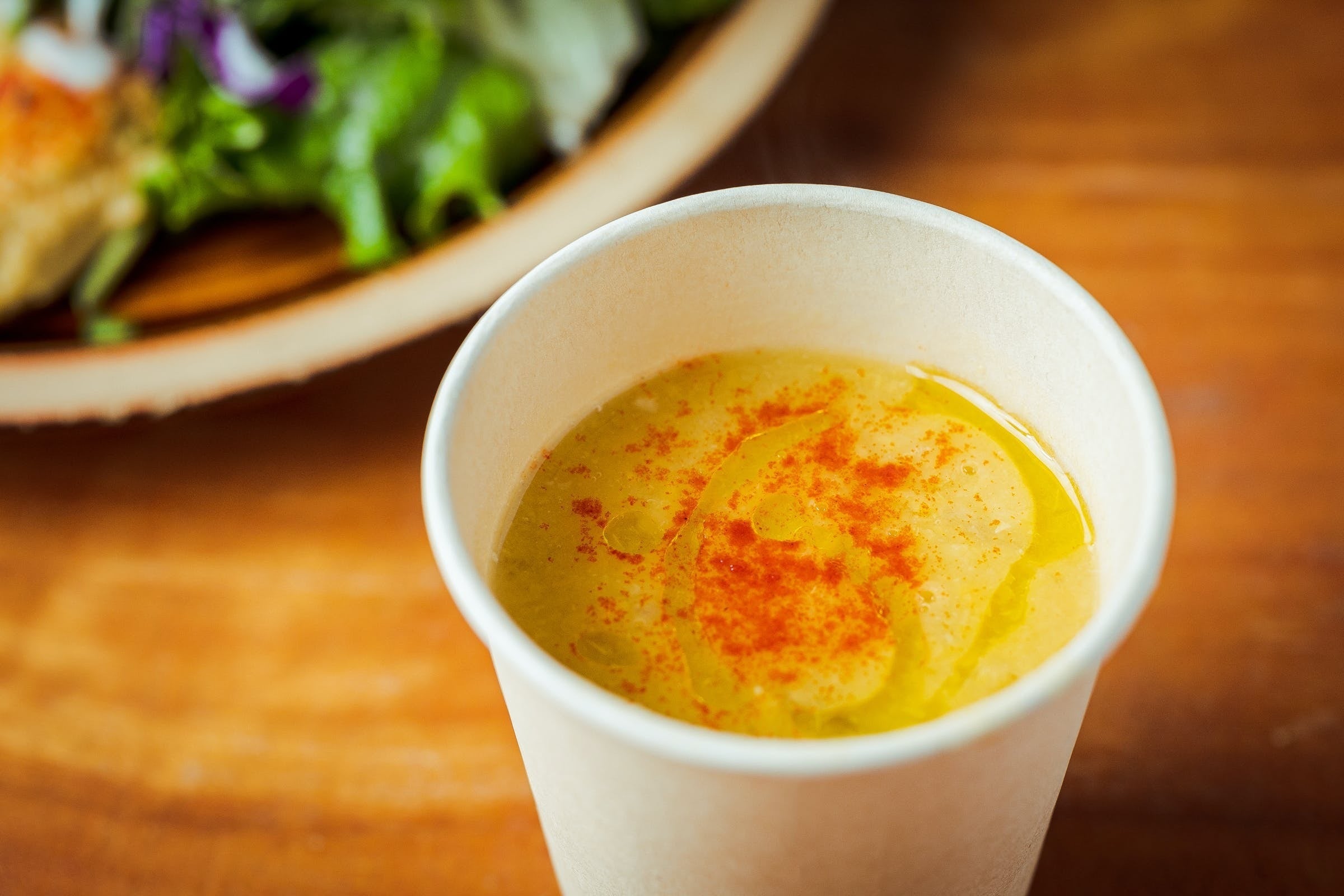 日替わりのセットスープも実は手の込んだ一品。調理の過程で出た野菜の根っこや芯を煮だしてとった「ベジフロス」という出汁を使っています。