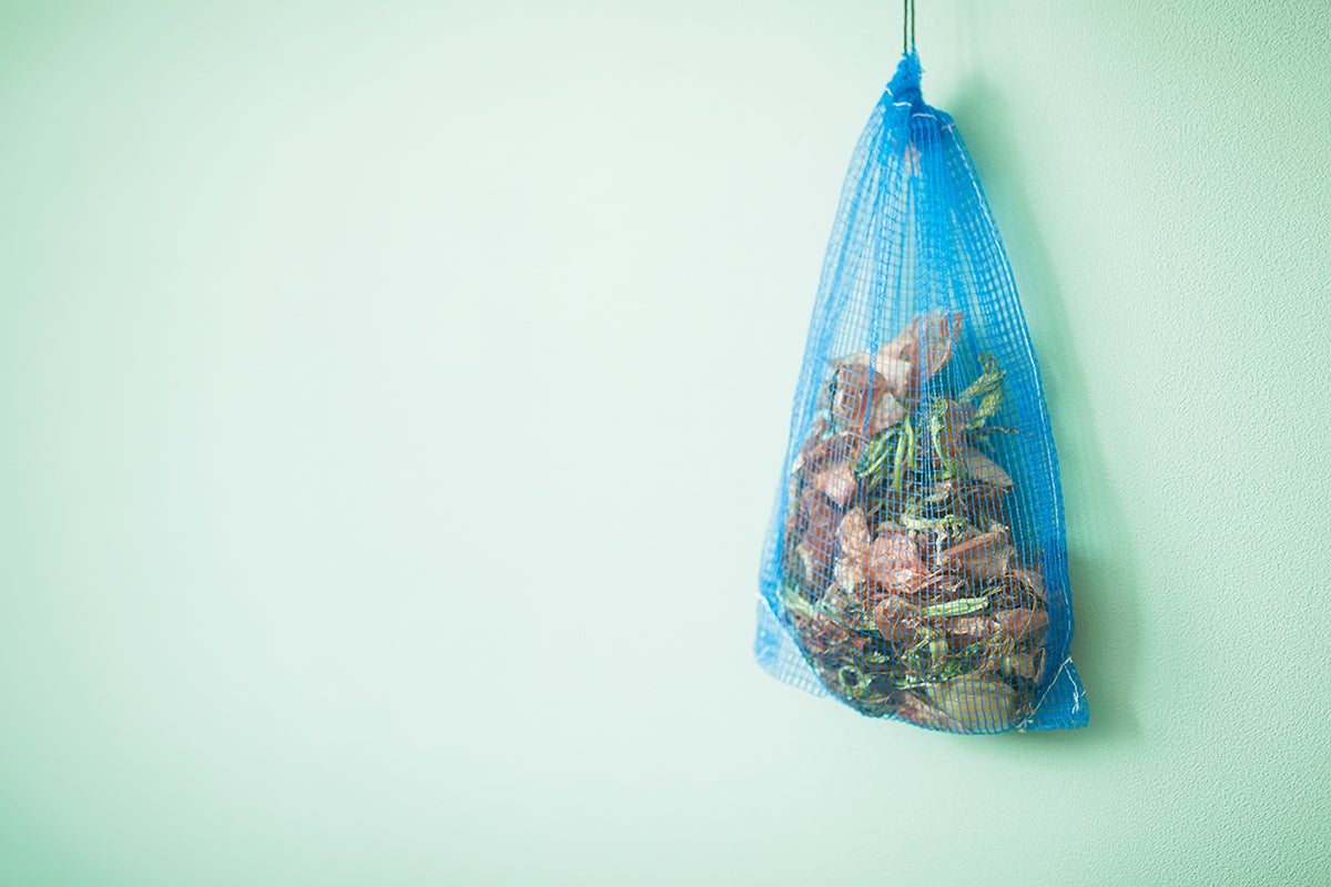 調理で出た切れ端やくず野菜から煮だして出汁をとれば、立派なスープに早変わり。さらに、出汁をとった後のくずごみは、ネットに入れて軒先で乾燥させた後、ミキサーで砕いて自家農園の肥料にする。