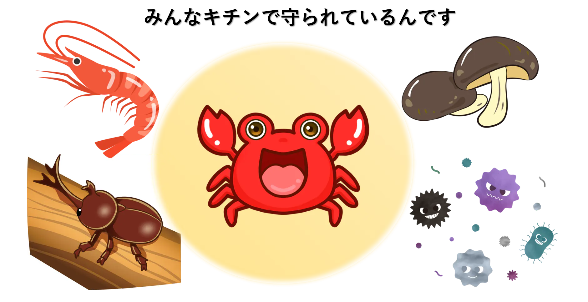 キチンとは、カニやエビ、昆虫などの節足動物の外骨格の主成分で、自然界の様々な生物の体を守っている、いわば「自然界が育んだ天然の繊維(多糖) 」です 。