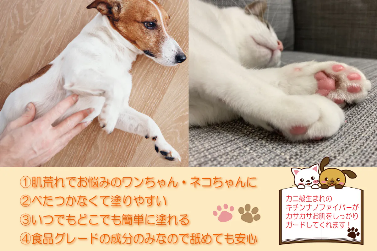 国立大学の研究から生まれた新素材「キチンナノファイバー」*¹ の特性を活かした、うるおいを保ちながら肌荒れを防ぐ、ワンちゃんネコちゃんのお肌や肉球を健やかに保つことができる保湿ジェルです。