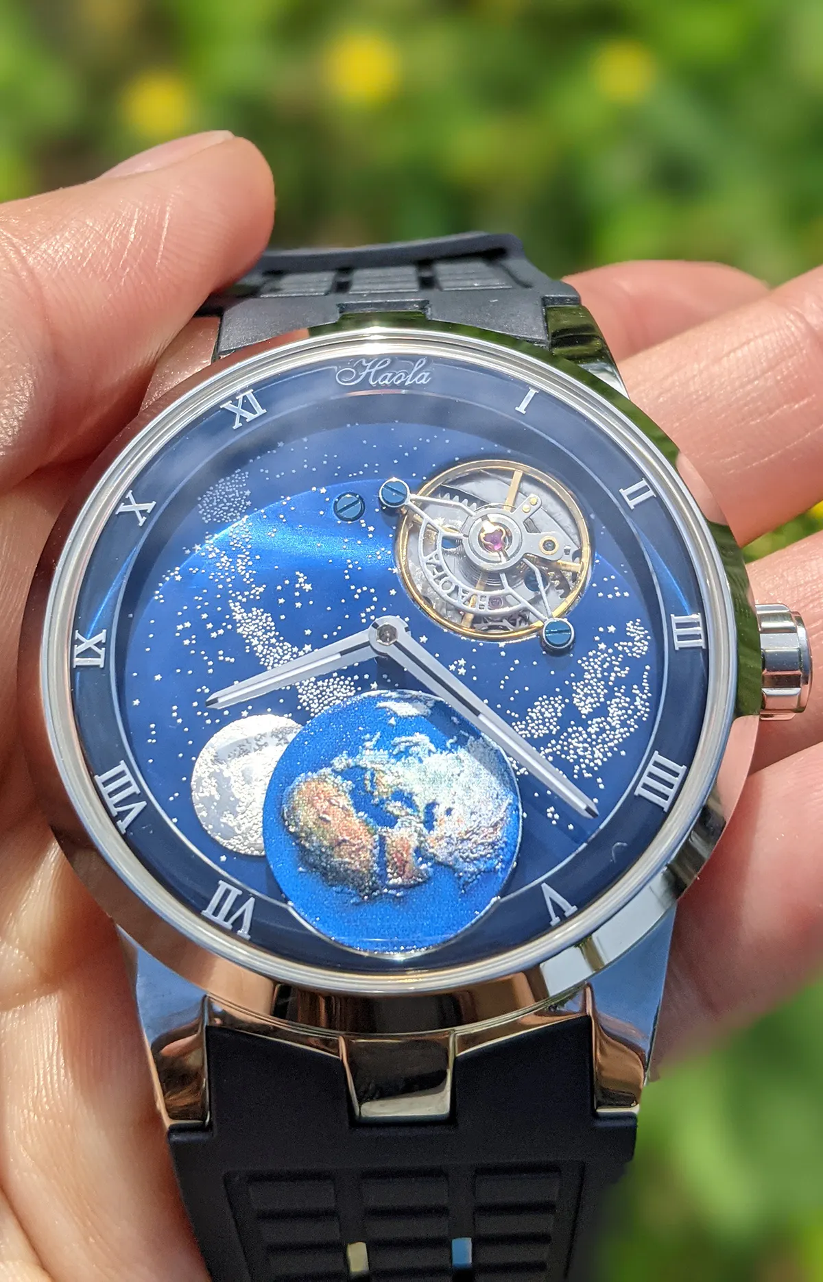 星空や地球と月を文字盤に再現しました。