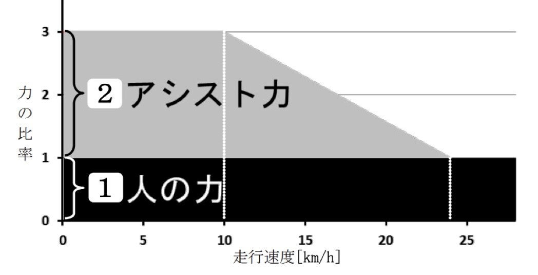 時速10kmまでアシスト比率1:2(最大値)のアシストを発揮し、時速10kmから時速24kmに上がるに連れて、徐々にアシスト比率が小さくなっていき、時速24kmを超えるとアシスト比率が0になり、モーターの稼働はストップします。