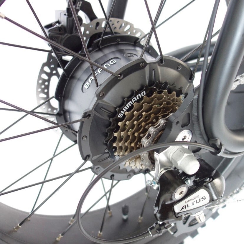 ファットアーバンクルーザーは、路面を選ばずどこにでもすばやく移動できる極太タイヤに、強力なミッドドライブモーターとシマノALTUS 7スピード変速ギアシステムが搭載されています。