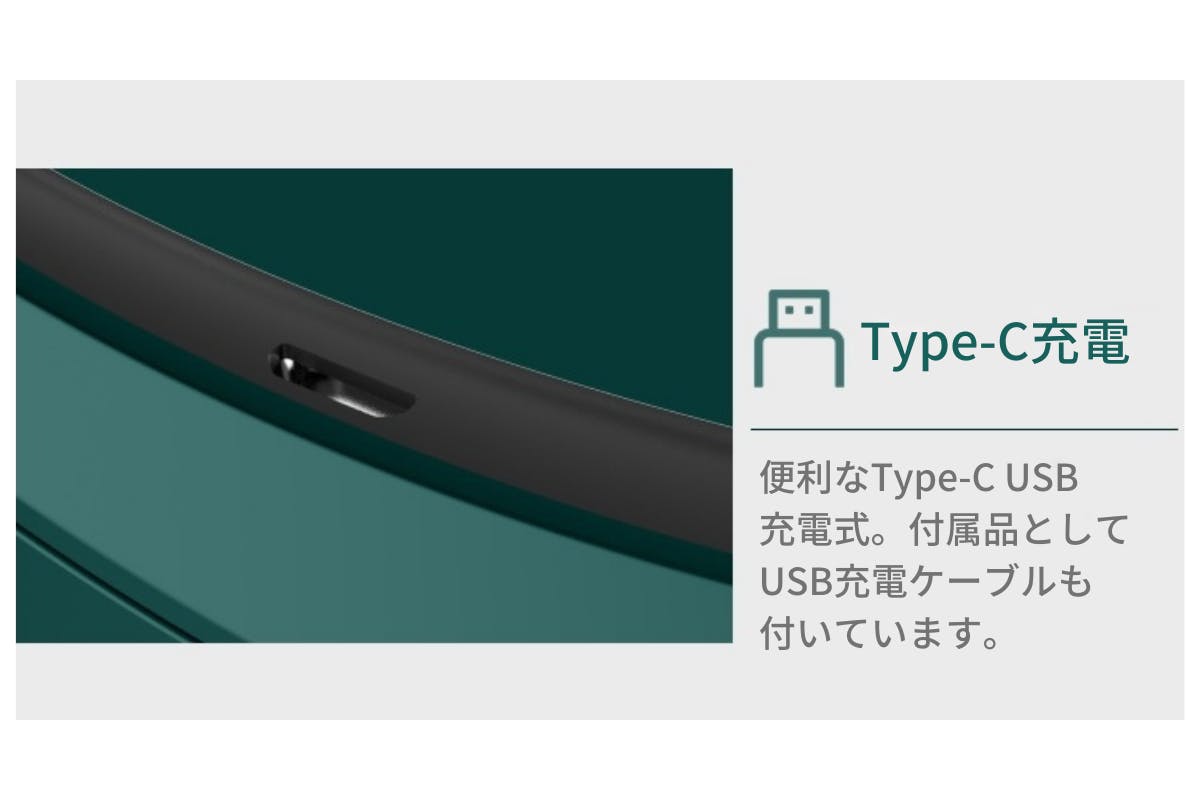 充電端子は、スマートフォンやタブレットなどで広く使用されているType-Cなので、お手元のパソコンやモバイルバッテリーなどでの気軽な充電が可能。
