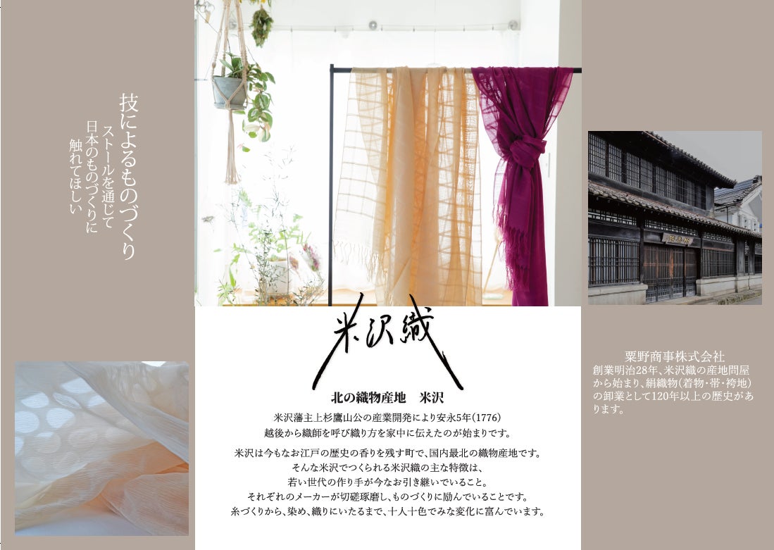 私たちは、山形県米沢市の伝統産業である「米沢織」で作られたストールの企画・販売をしております。