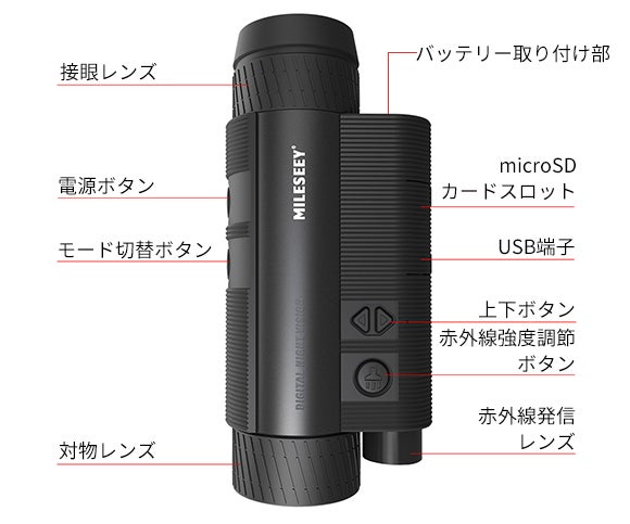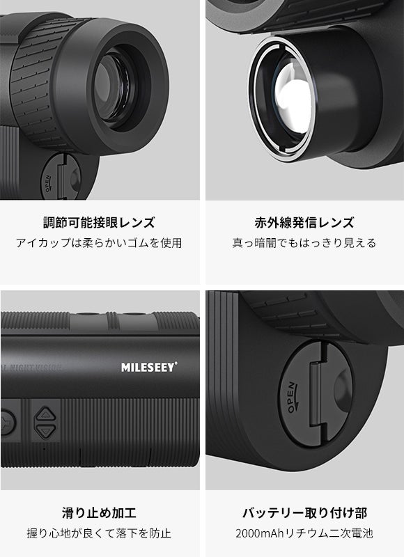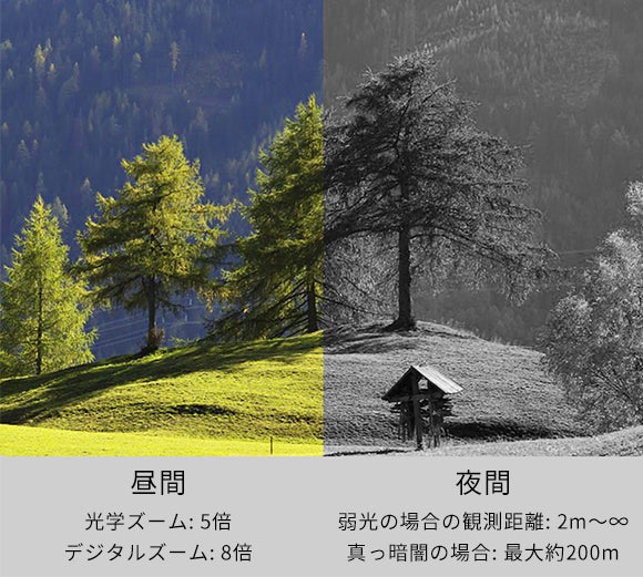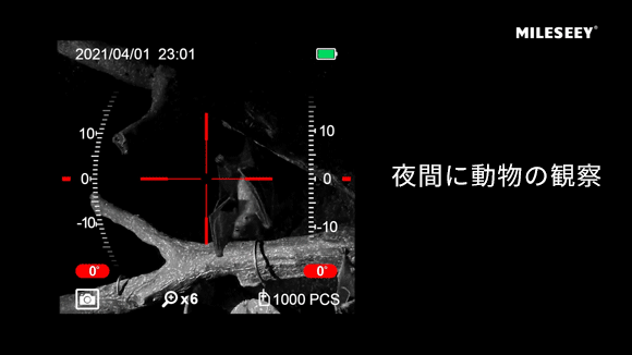 MILESEEY NV20は昼夜兼用。昼間は単眼鏡として遠くまで映し出します。真っ暗闇の夜間には、赤外線機能を利用すれば最大約200m先まで観察できます。わずかな光があれば赤外線を使わなくてもくっきりと見えます。