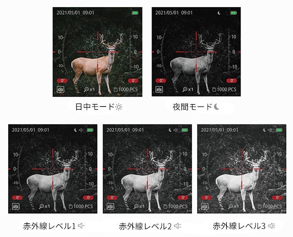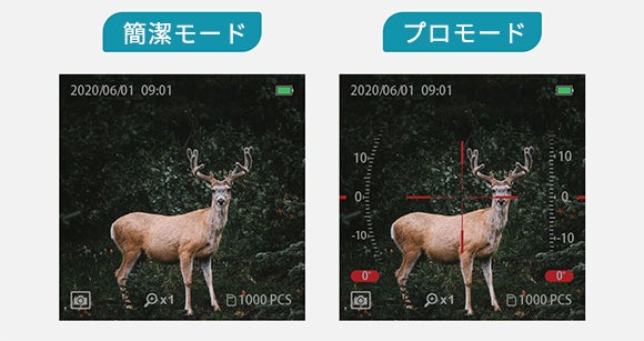 日付・時刻・保存可能な画像枚数と録画時間・赤外線強度・バッテリー残量・モードアイコン・デジタルズームの拡大倍率・ピッチ角・ロール角などが表示され、撮影の時や機器を使用する時に便利です。