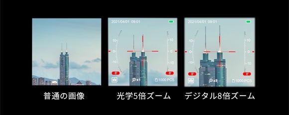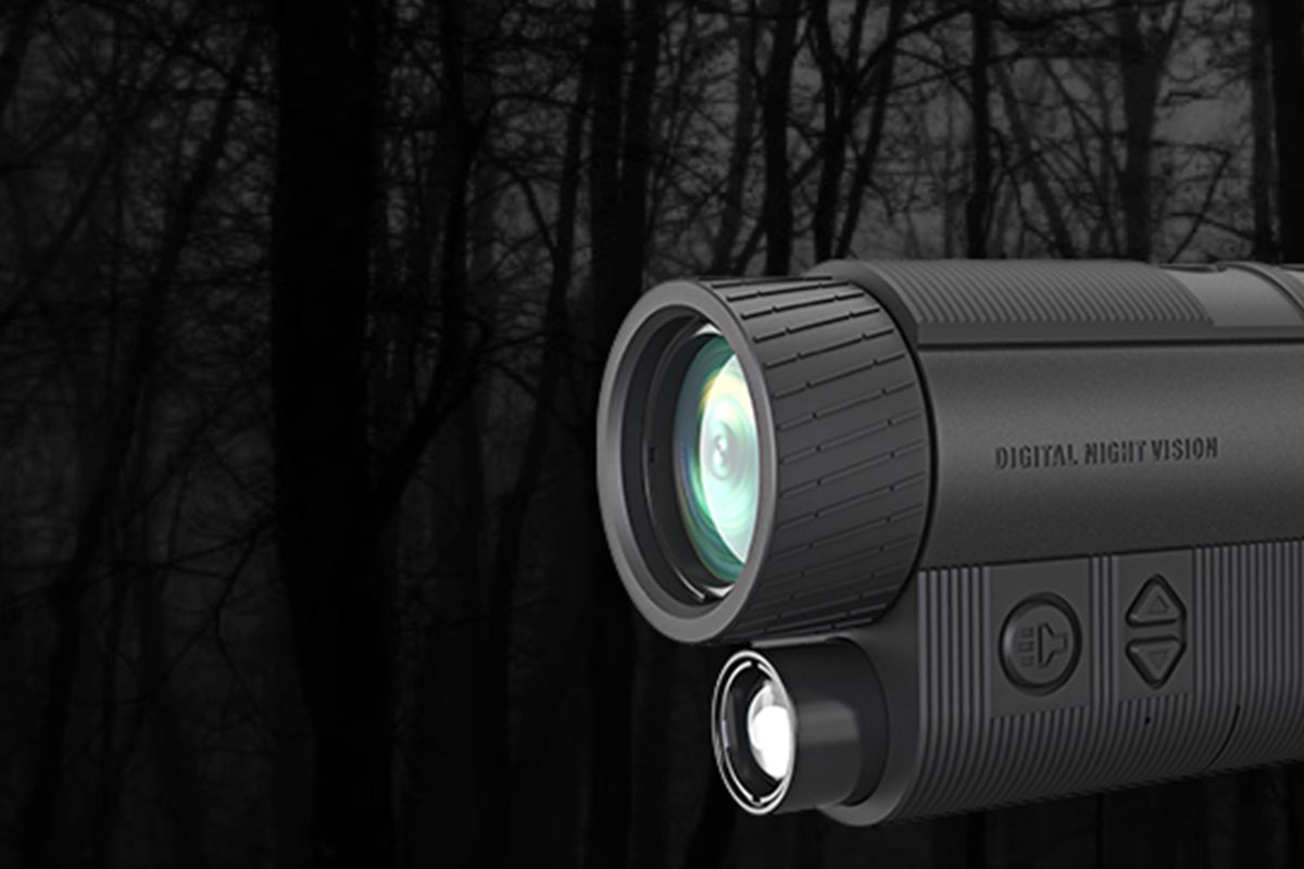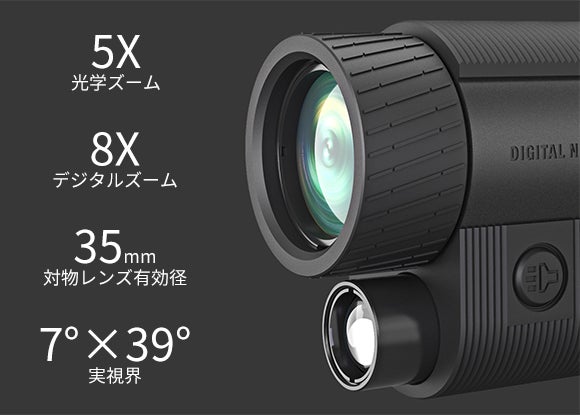ナイトビジョン単眼鏡の接眼レンズと対物レンズを回転させると、光学倍率が調節されます。機器本体の「△▽」ボタンを押すとデジタル倍率を増減することができます。対物レンズ有効径は35mm、実視界は7°×3.9°で、視野を拡大し、より広い範囲を観察可能です。アイカップも柔らかいゴムでできて使い心地がアップしています。