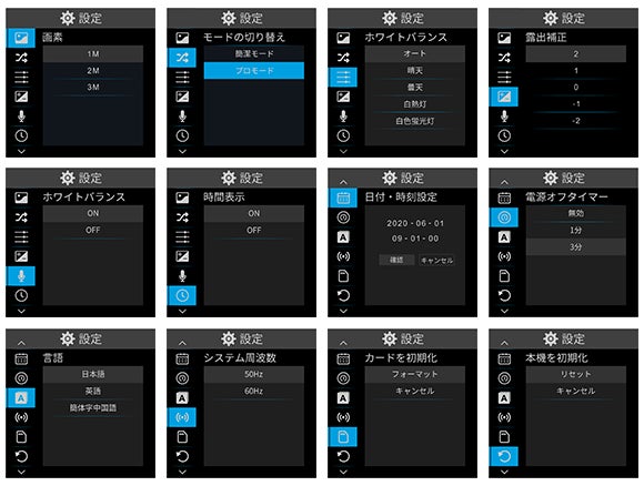 静止画撮影時の画素数は1M、2M、3Mの3種類から選べます。