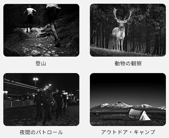 小型軽量で携帯に便利で、動物の観察、スポーツ観戦、ライブ会場、畑の監視、狩猟、釣り、獣害対策やキャンプなど様々な場合に活躍します。首かけ用ストラップとハンドストラップも付属しているので、山登りや夜釣りの際にも落下の心配がありません。柔らかいゴム製の外装も滑り止め・落下防止のメリットがあります。